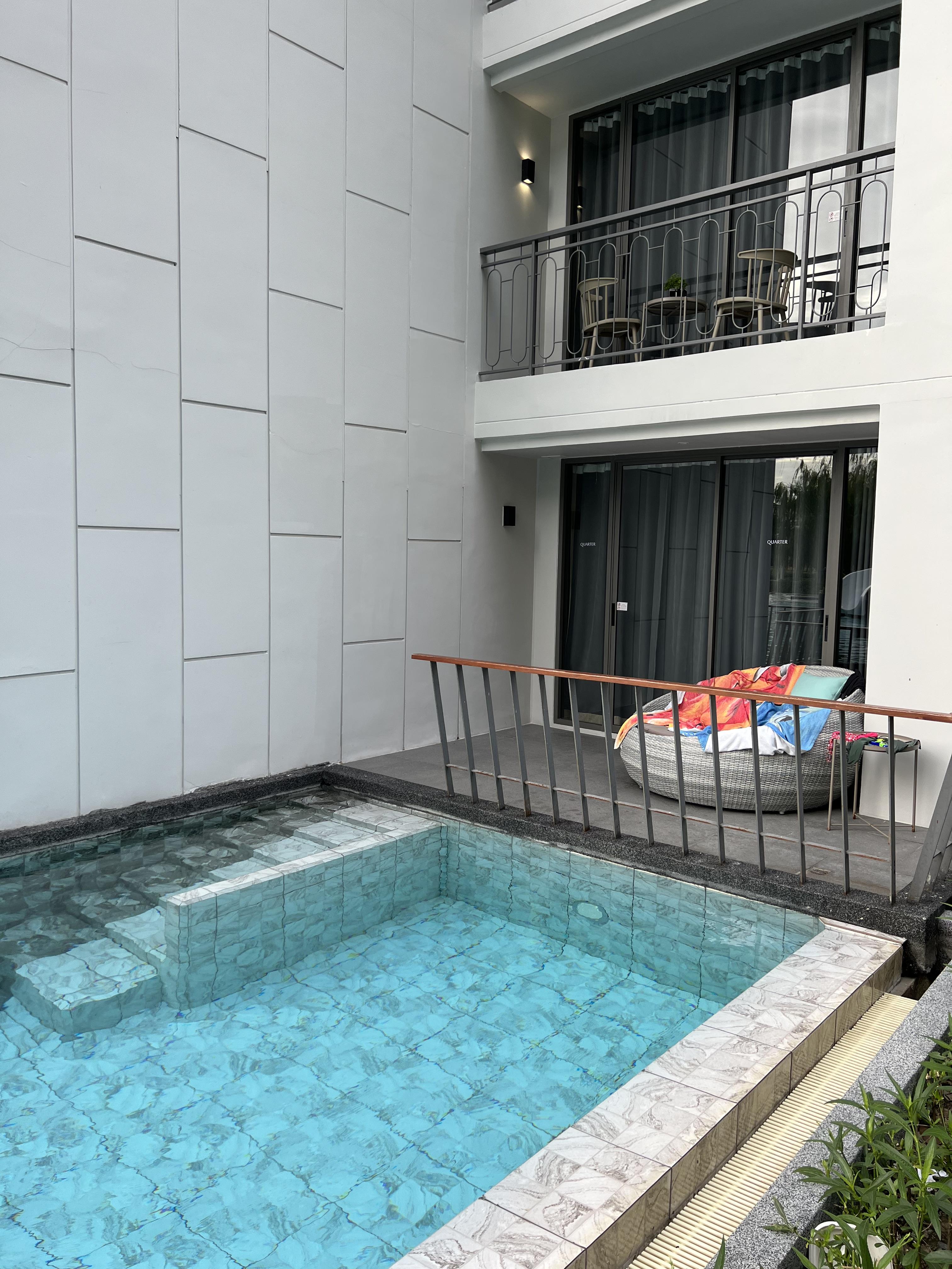 아래 사진을 보게 되면 발코니를 통해 수영장으로 내려가는 공간을 볼 수 있는데 다시 사진으로 봐도 특이하고 이색적입니다. 방과 연결되어 있는 발코니에서 바로 수영장과 연결이 되고 발코니에는 의자와 테이블이 있어 물놀이 이후에 라면이 먹기에 딱 좋았습니다.