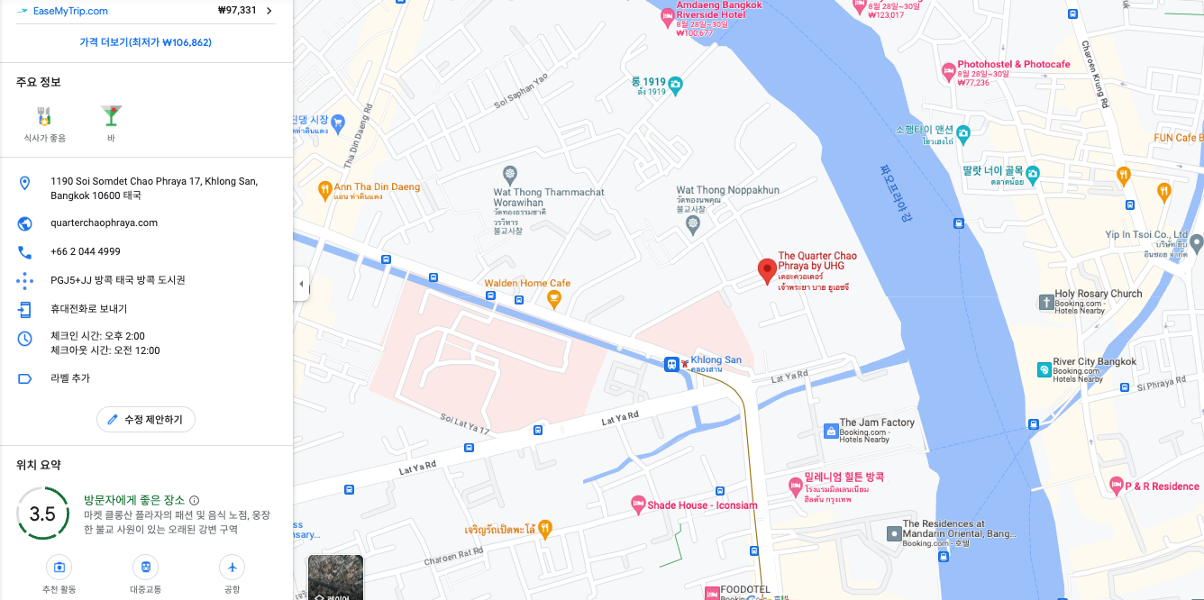 저가항공을 타고 방콕을 가게 되면 새벽에서야 도착하는데 어쨌든 호텔은 잡아야 하니 더욱 가성비 있는 호텔을 열심히 찾아 보았습니다. 그 와중에 발견한 호텔이 "더 쿼터 짜오 프라야(The Quater Chaophraya By UHG)"입니다.