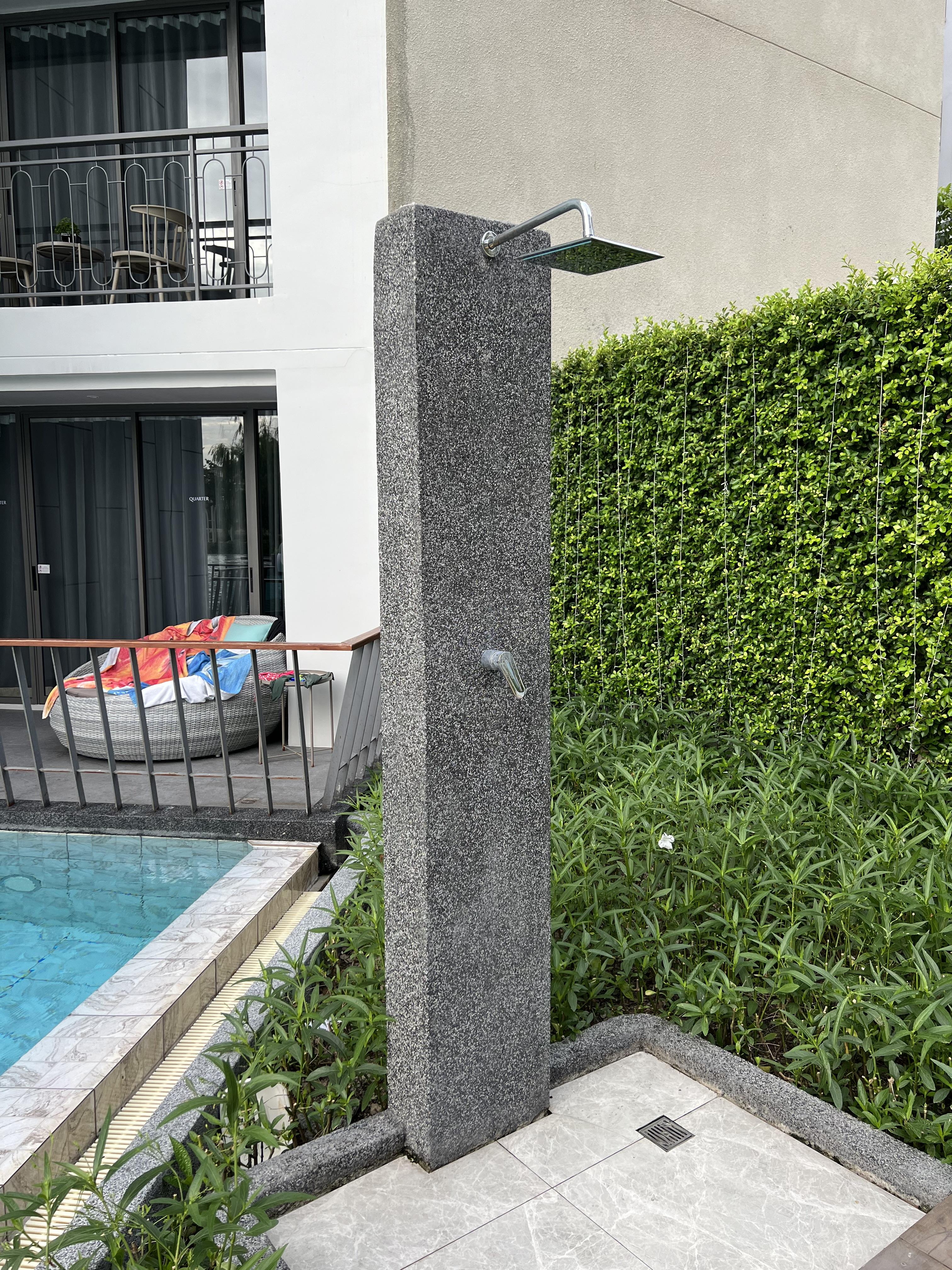 아래 사진을 보게 되면 발코니를 통해 수영장으로 내려가는 공간을 볼 수 있는데 다시 사진으로 봐도 특이하고 이색적입니다. 방과 연결되어 있는 발코니에서 바로 수영장과 연결이 되고 발코니에는 의자와 테이블이 있어 물놀이 이후에 라면이 먹기에 딱 좋았습니다.