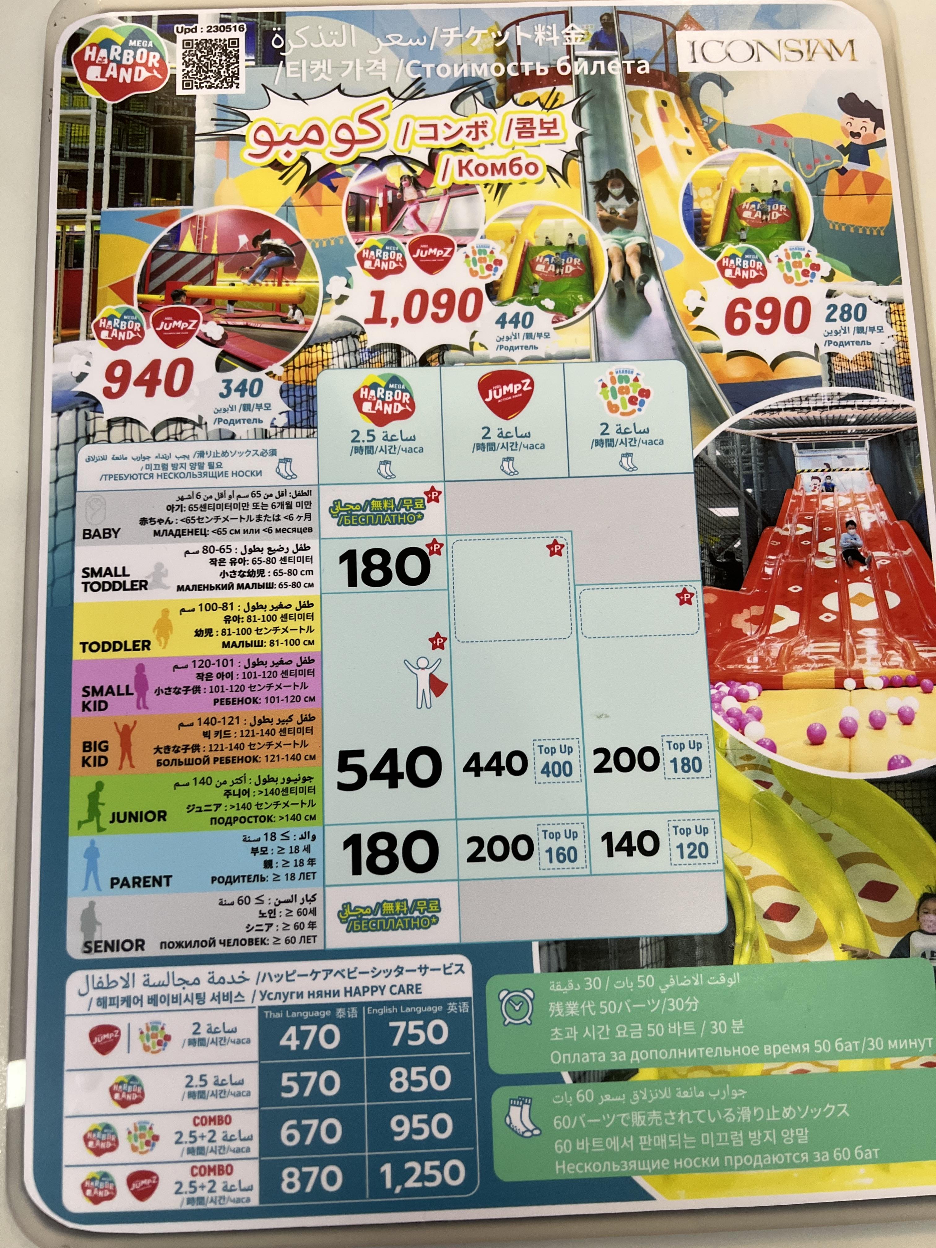 하버랜드 안에는 총 3개의 시설(Habourland, Jumpuz, Inflatable)이 모여있습니다. 각 시설마다 입장료가 다르고 3개의 시설을 모두 이용 하려면 1,090바트가 필요합니다. 거기에다 미끄럼 방지 양말과 부모 입장료까지 더해서 저는 총 1,655바트를 지불했습니다.