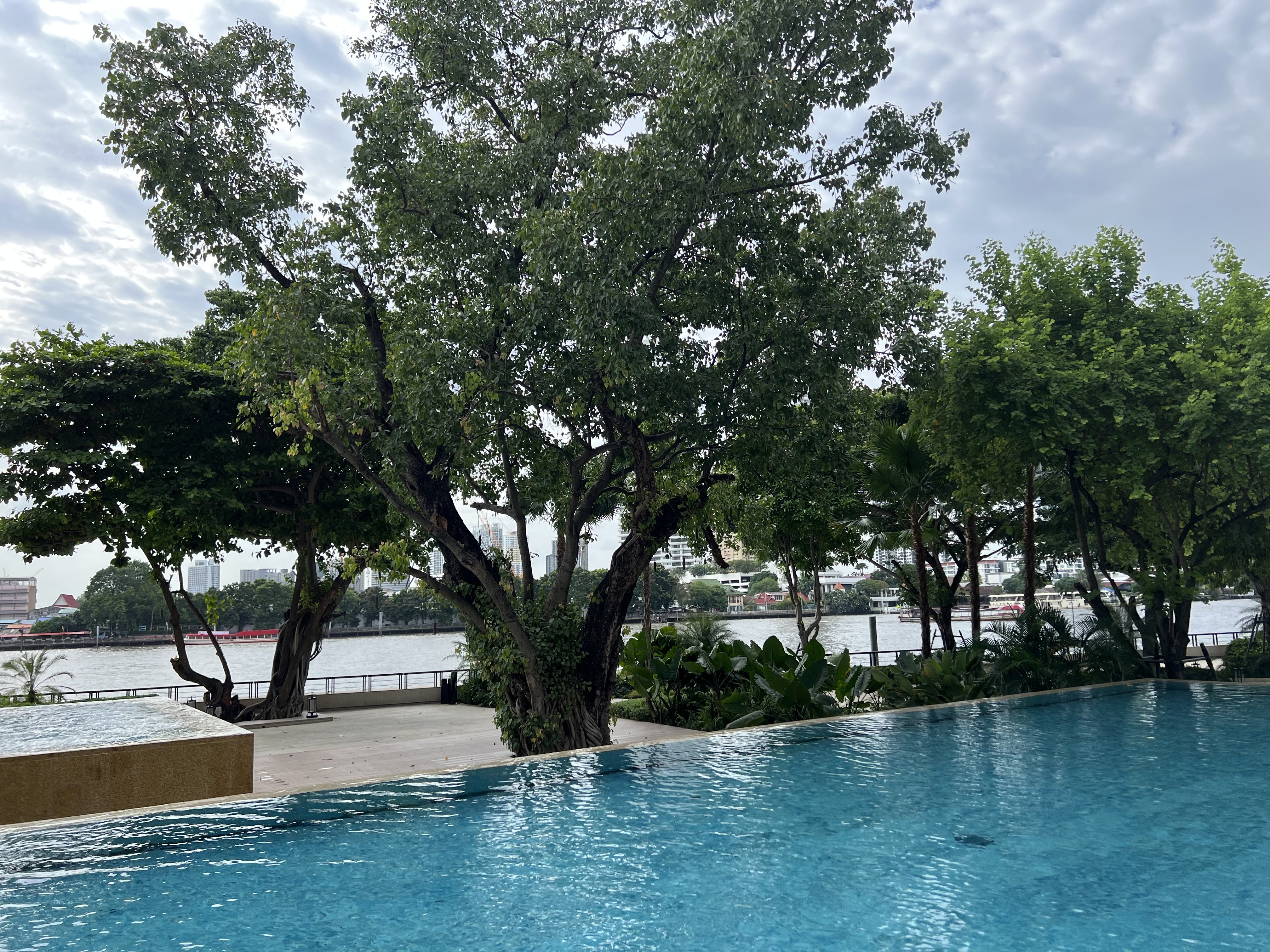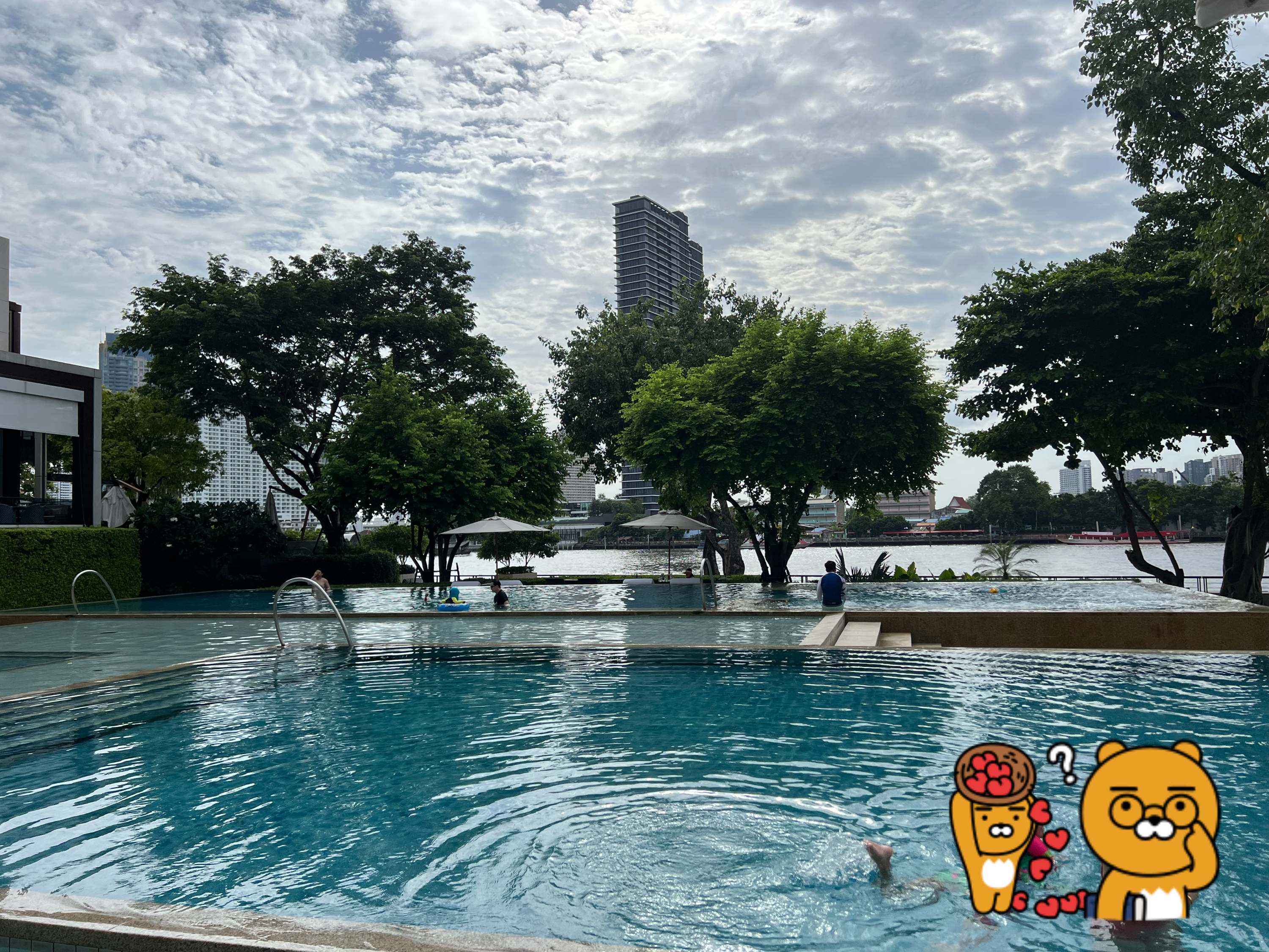 강이 보이는 곳으로 걸어가다 보면 메인 수영장이 보입니다. 아이들이 놀 수 있는 얕은 풀장이 있고 메인 풀이 두 곳이 있습니다. 전체 크기는 아쉬운 편입니다. 길이는 약 20미터 남짓해 보이고 호텔의 크기에 비해 수영장이 주는 임팩트는 약했습니다.