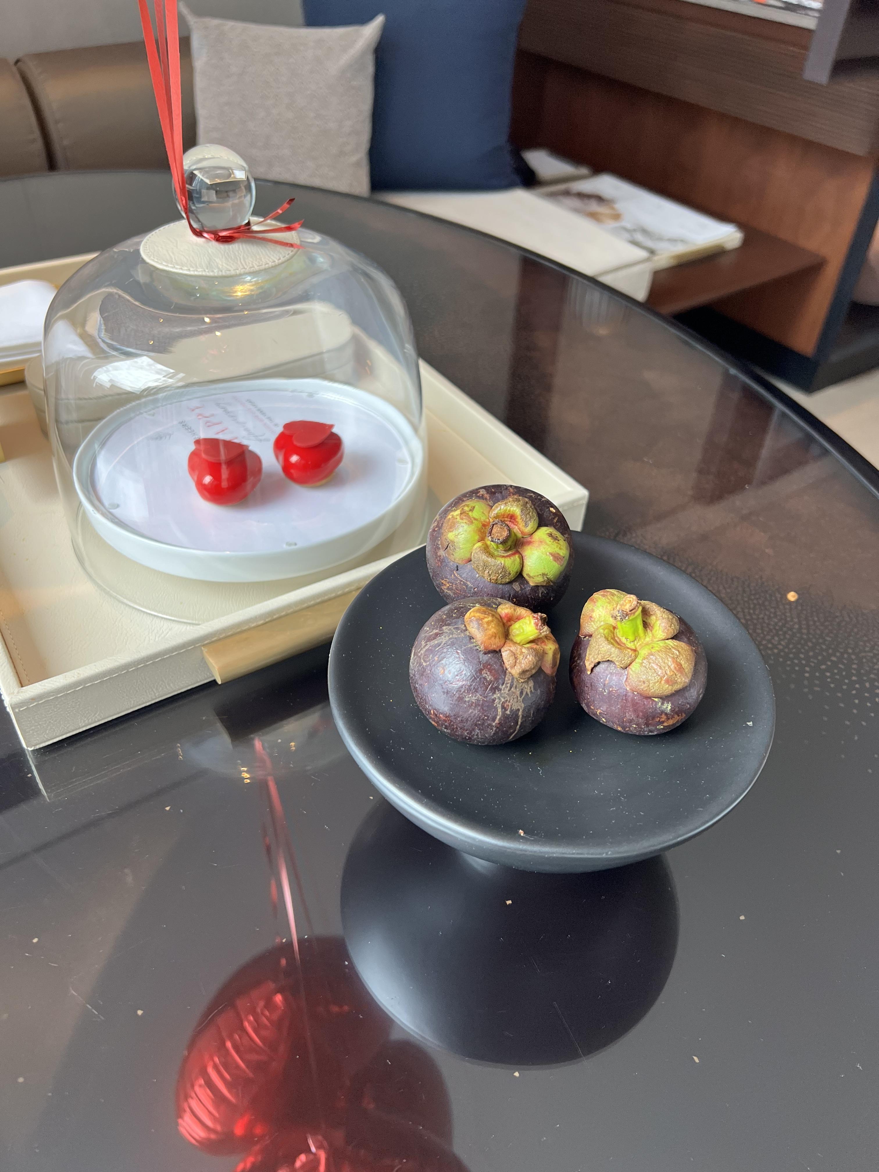 그 외에 망고스틴과 작은 케익까지 정말 서비스에 놀라지 않을 수가 없습니다. VIVIGO 앱을 통해 와인을 검색해보니 판매가 가무려 44,000원이 넘는 와인입니다. 아이 티셔츠에 와인에 올리브에 망고스틴에 벌써 10만원 정도의 서비스는 받은 것만 같습니다.