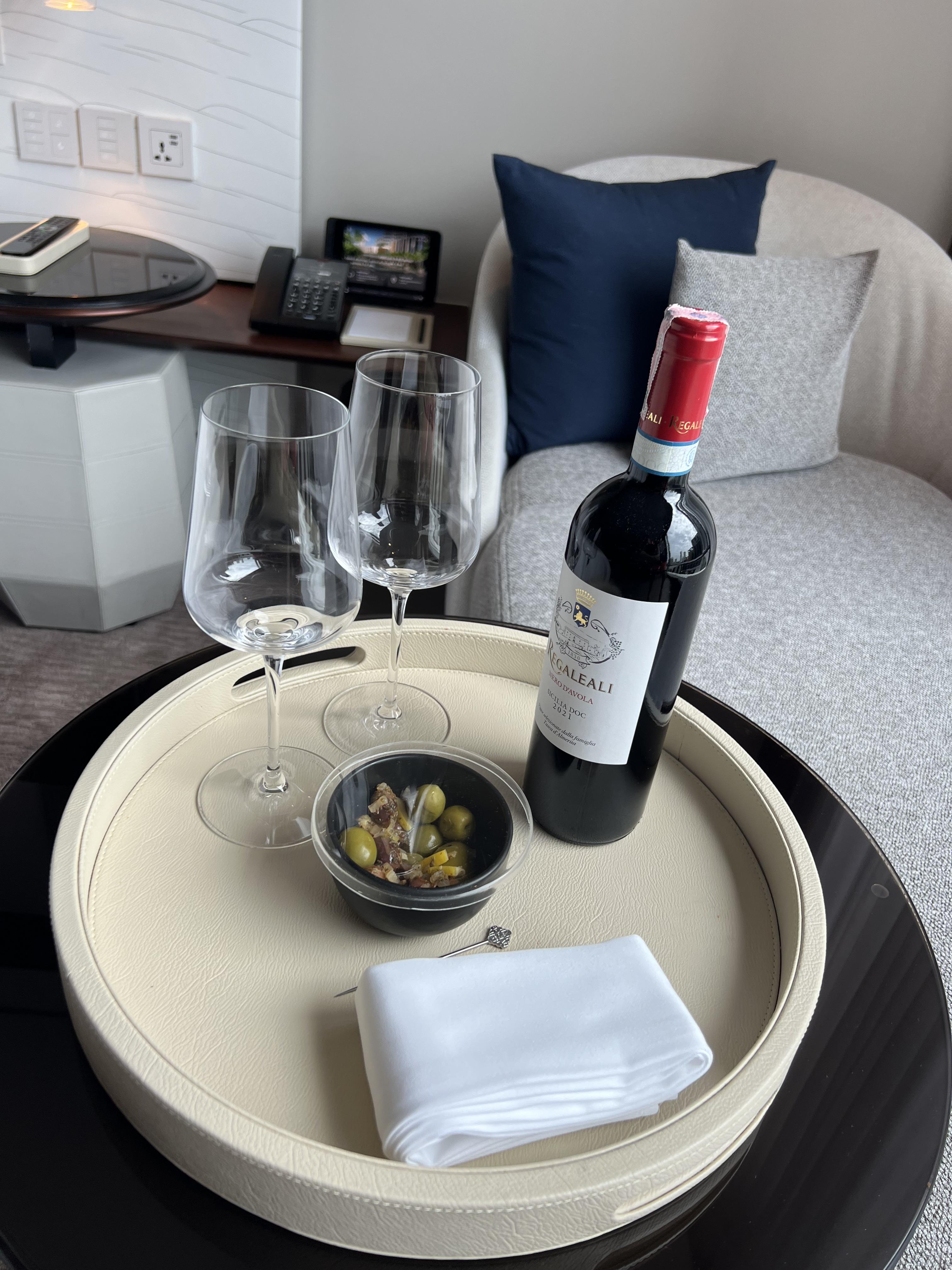 결혼 기념일이 아니더라도 비싼 호텔을 예약할 때는 결혼기념일이니 잘 부탁한다는 메시지를 종종 적어둡니다. 보통은 케이크나, 꽃 장식을 방 안에 꾸며주는 것이 일반적이지만, 포시즌스는 와인+올리브를 준비해 주었습니다.