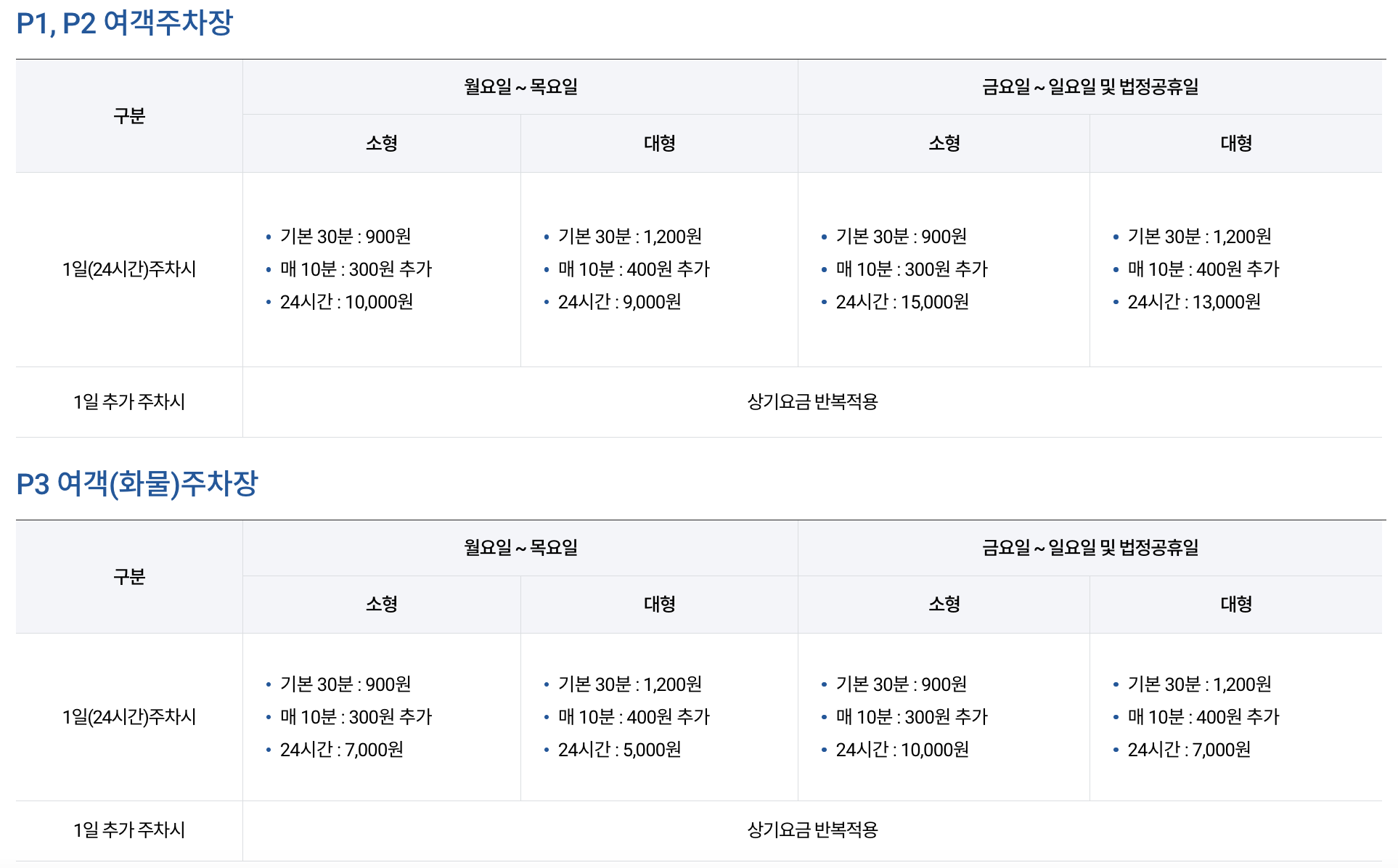 저도 8월 첫째 주에 휴가를 다녀왔는데 공항 주차장이 이미 만차여서 꽤 오랜 시간을 주차하기 위해 기다려야 했습니다. 그리고 공항 주차장 요금이 너무 비싸지는 않을까 걱정하는 분들도 많을 텐데 결론부터 말씀드리면 생각보다 비싸지 않으니 아이와 같이 가거나 짐이 많은 분들은 공항 주차장 이용하는 것을 추천드립니다.