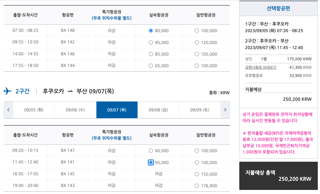 예시를 위해 가고싶은 여행지를 일본으로 설정하고 검색해 보겠습니다. 가장 상단에 나오는 여행지는 부산-후쿠오카 왕복 항공권이며 비행기표는 169,900원입니다. 동일한 조건을 에어부산에서 직접 검색해 보니 250,200원으로 무려 82,100원이 저렴합니다.