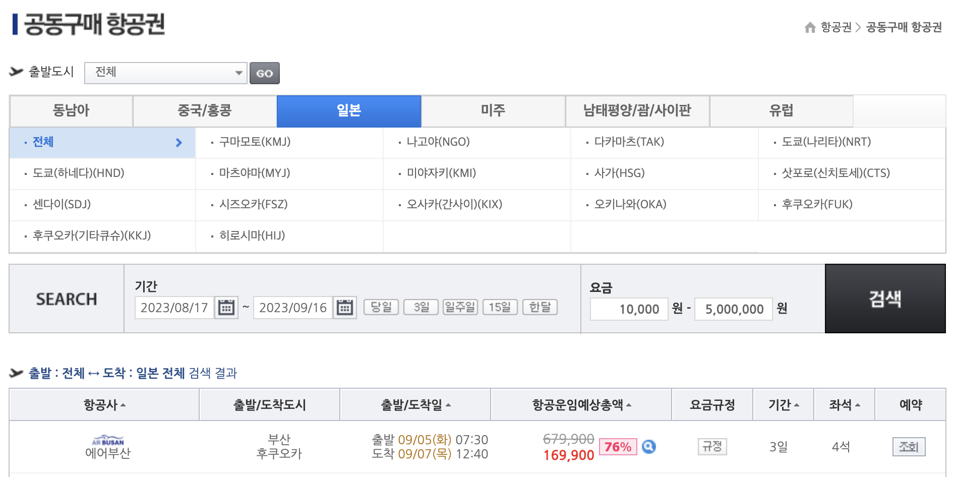 여행 비용 중에 비행기표가 가장 부담이 될텐데요. 부담을 줄여주기 위해 특별한 정보를 공유 드립니다. 비행기표 가격을 비교할 때 공동구매항공권을 꼭 확인해 보세요!! 일본여행은 최대 76% 저렴하니 완전 이득입니다!!