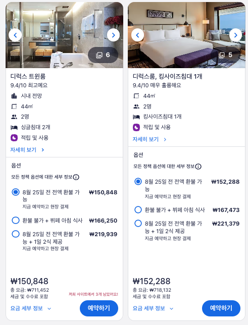 호텔스닷컴은 최저가 보상제도를 운영하기 때문에 동일한 조건이면 무조건 최저가와의 차액을 환불해 줍니다. 그렇기 때문에 어떤 상황에서도 최저가를 보장해 준다는 것을 의미하고 다른 예약 사이트와 가격을 비교하는 것이 무의미합니다.