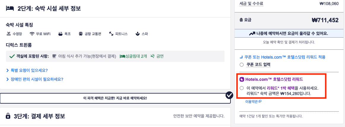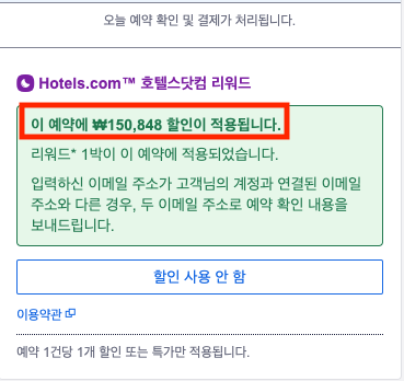 호텔스닷컴에서 가장 강조하는 혜택은 리워드 제도입니다. 쉽게 말해 호텔스닷컴을 통해 10박을 모으면 1박을 공짜로 사용할 수 있는 쿠폰을 주는 것입니다. 저는 벌써 8번을 리워드 쿠폰을 사용했고, 이번에 또 1박 쿠폰이 생겨서 여행 갈 준비를 하고 있습니다.