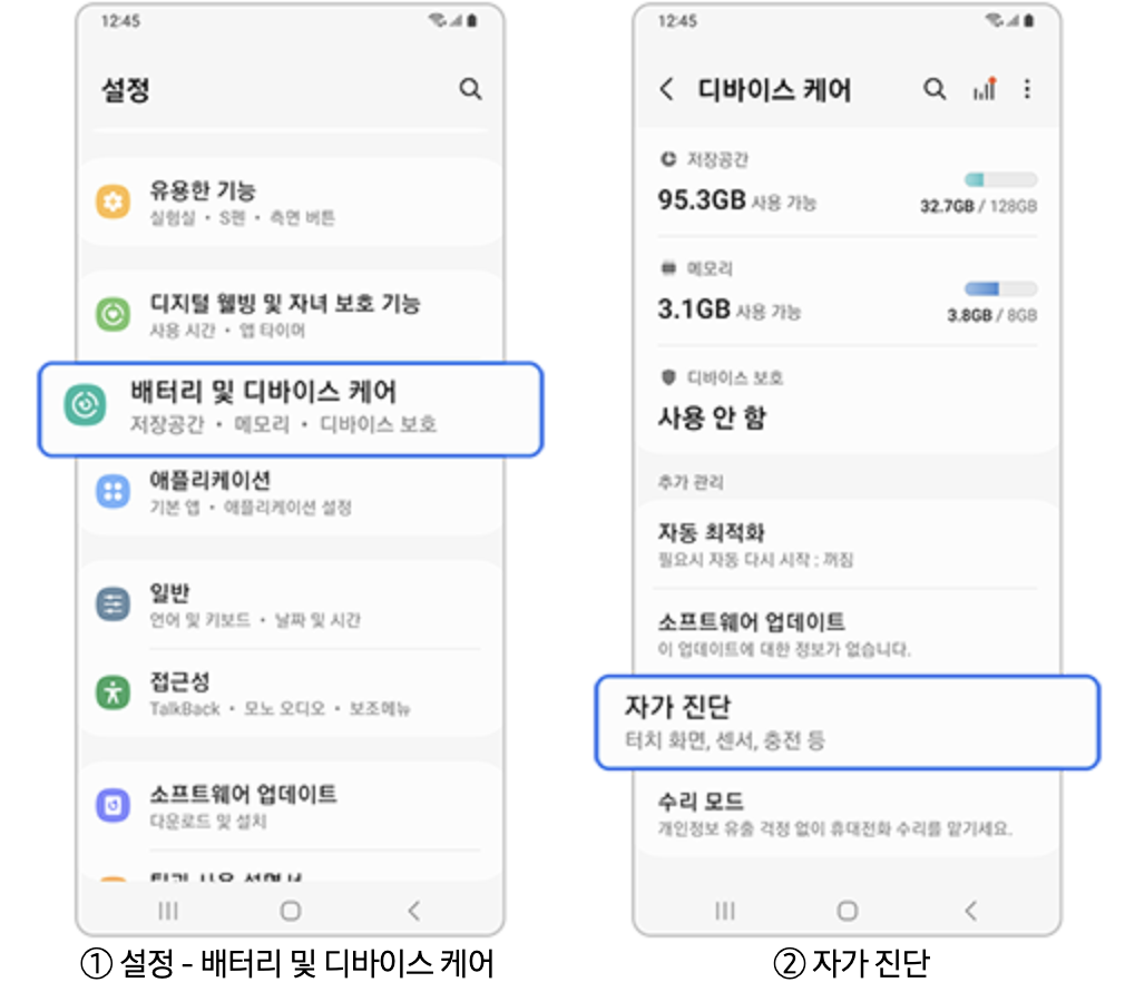 ❖ 설정 ➤ 배터리 및 디바이스 케어 ➤ 자가진단 ➤ 휴대전화 진단 ➤ 전체 진단 시작 ➤ 배터리 상태 확인