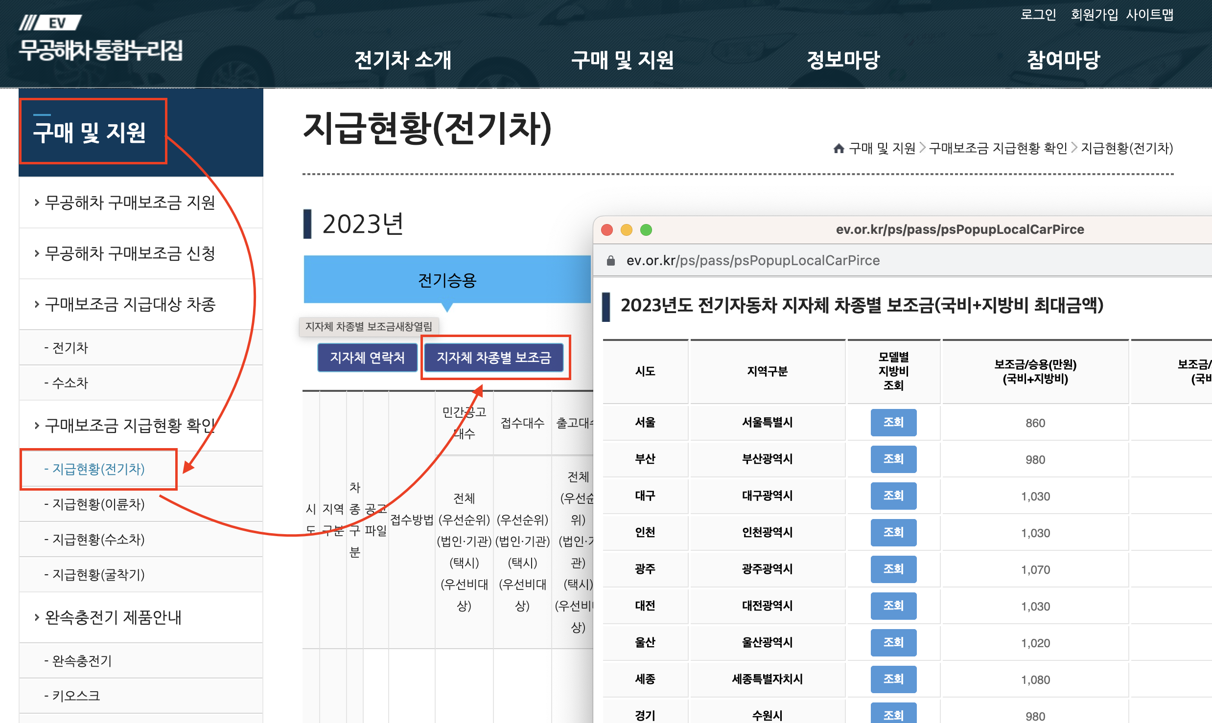 ❖ 접속 경로 : 무해공차 통합누리집 ▶︎ 구매 및 지원 ▶︎ 구매보조금 지급현황 확인 ▶︎ 지급현황(전기차) ▶︎ 지자체 차종별 보조금