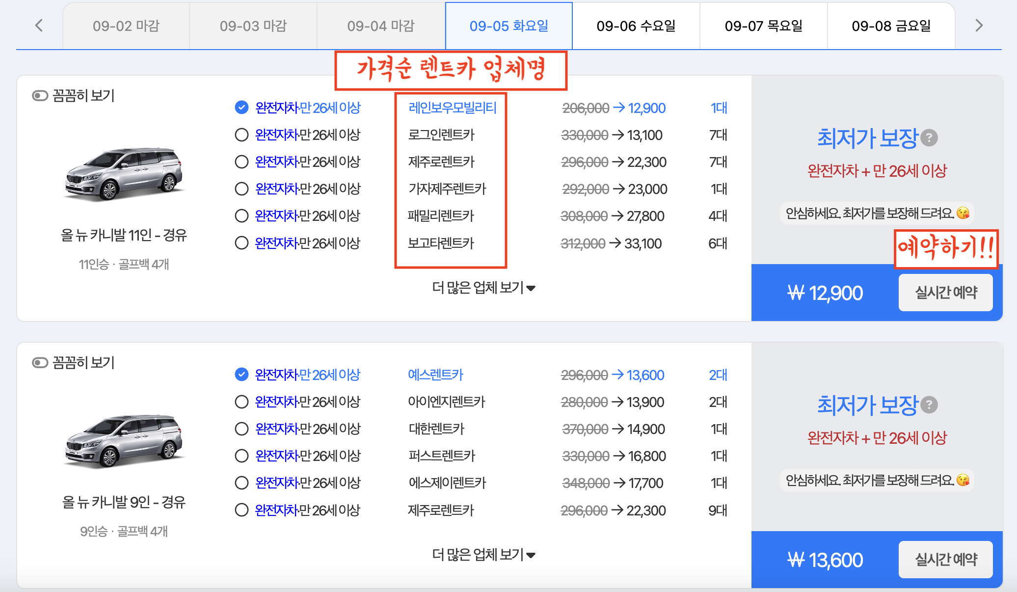 2. 원하는 차종을 선택한 뒤 렌트카 업체별 가격을 확인합니다.