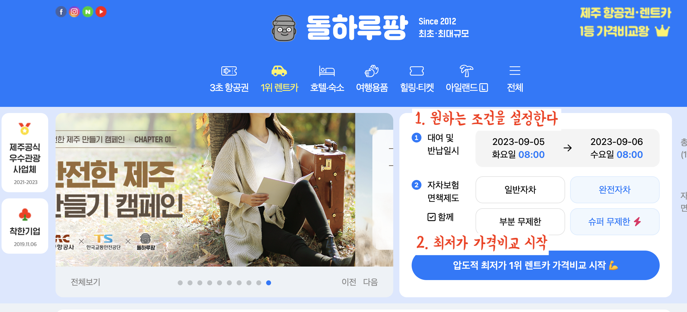 간단하게 소개하자면 돌하루팡은 렌트카의 가격을 비교해주고 최저가를 찾아주는 사이트입니다. 즉, 돌하루팡은 렌트카를 운영하는 회사가 아니라 가격만 비교해주고 예약을 도와주는 사이트로 이해하면 됩니다.