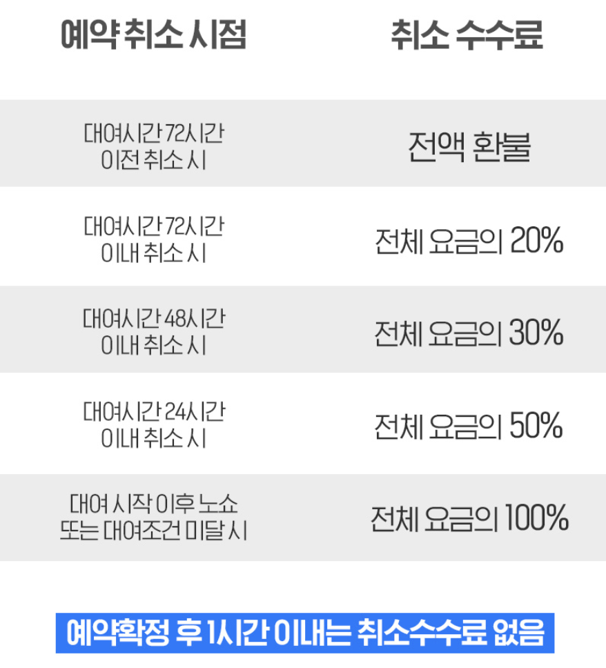 단순 변심이라도 예약 확정 후 1시간 이내에 취소하게 되면 취소 수수료가 발생하지 않습니다. 단, 대여시작 2시간 이내에 예약했다면 전체 요금의 50% 취소 수수료가 발생합니다.