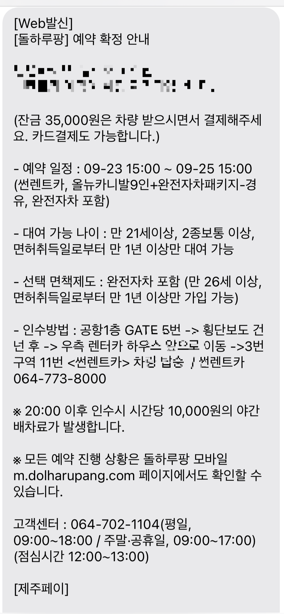 3. 예약을 진행하면 실제 렌터카 회사로부터 예약 안내 문자를 받을 수 있습니다.