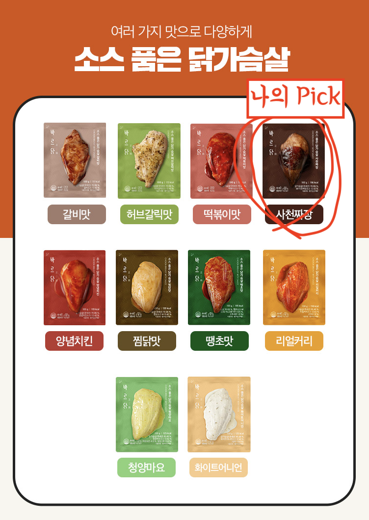 소스가 포함된 제품 중에서는 바르닭에서 파는 소스 품은 닭가슴살이 최고입니다. 소스가 다양하게 있는데 그중에서 저는 사천짜장맛을 가장 좋아합니다. 닭가슴살을 잘라서 밥이랑 비벼먹으면 그냥 짜장밥이에요