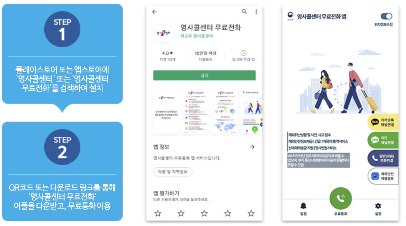 만약에 로밍을 하지 않았다면 콜센터에 전화하는 전화 요금이 걱정될 수도 있는데요. 외교부에 무료로 전화할 수 있는 어플이 있습니다. 단, 와이파이(인터넷) 연결이 가능한 상태에서 다운로드 혹은 전화 연결이 가능하고 아니라면 데이트 요금이 부과 될 수 있습니다.