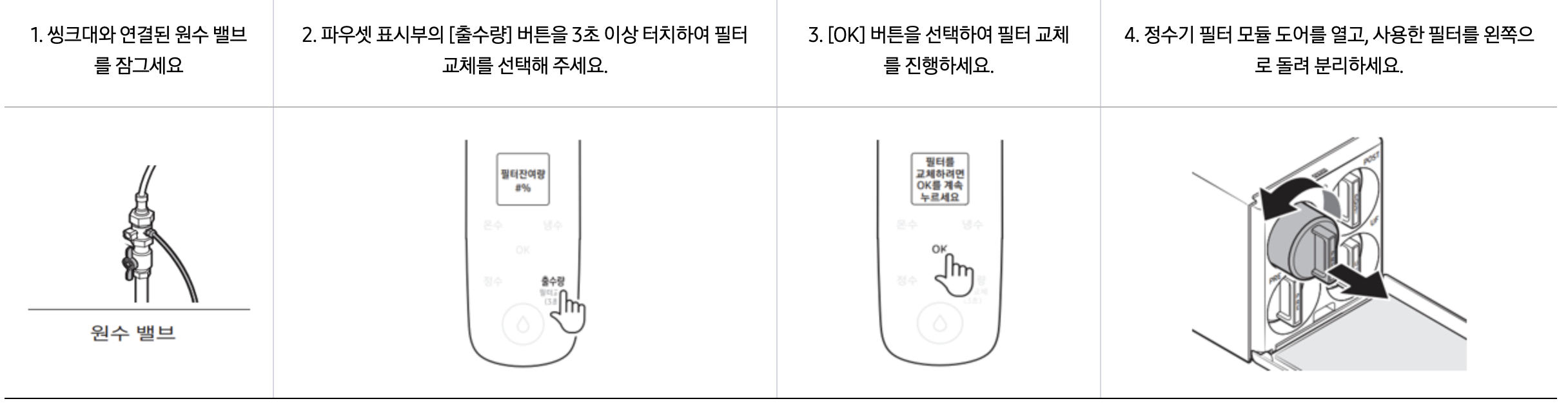 - 파우셋 표시부의 [출수량] 버튼을 3초 이상 터치하여 필터 교체를 선택