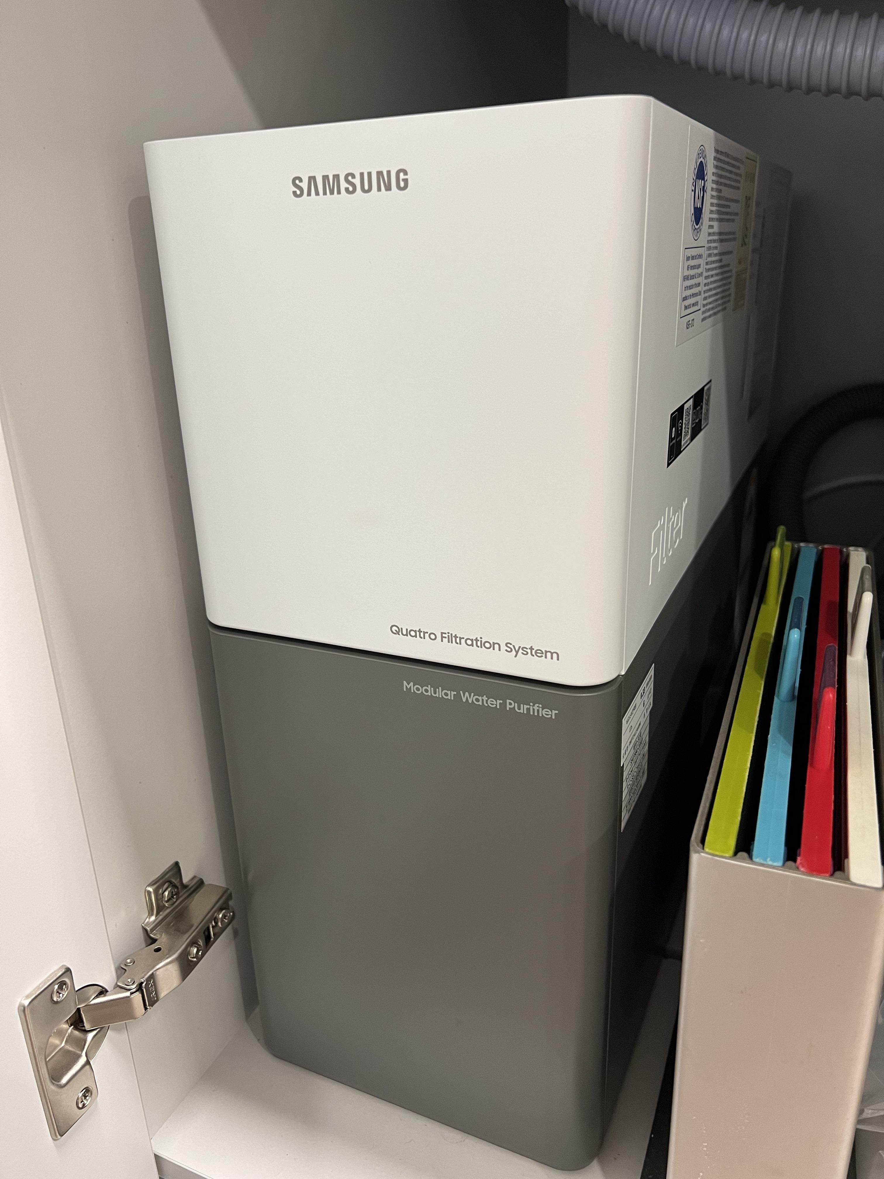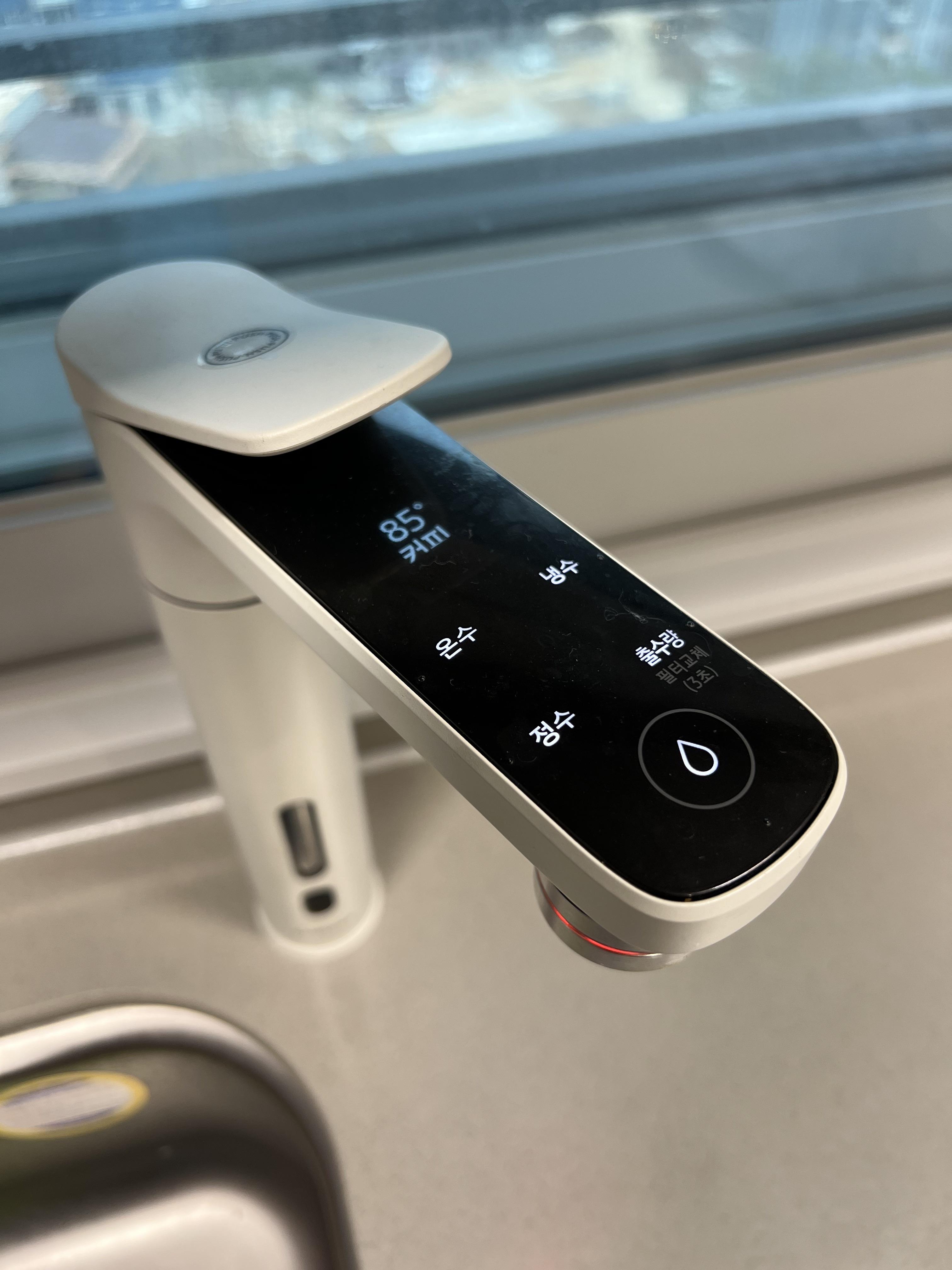 실제 저희집에 설치한 비스포크 정수기인데 정말 미니멀하고 깔끔한 디자인이에요. 싱크대 오른쪽에 위치해서 공간도 적게 차지하고 음식할 때 바로 사용할 수 있어 아주 좋아요. 냉수를 누르면 필터 끝부분이 파란색, 온수를 누르면 빨간색이 되는데 직관적으로 보기도 편하구요.