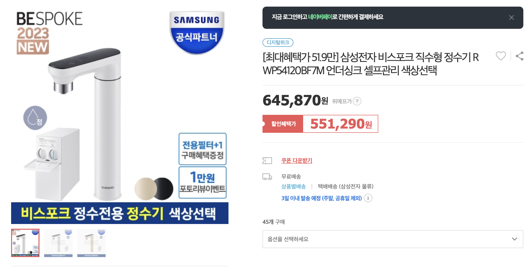 2023년형에다 정수기 필터까지 무료로 주고 있고, 삼성전자 공식파트너라 전혀 걱정할 것도 없으니 굳이 비싼 돈주고 삼성닷컴에서 구매할 필요없이 오픈 마켓을 통해 구매하는 것이 가격적으로는 더욱 좋습니다.