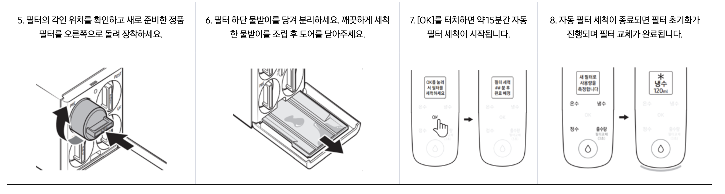 비스포크 정수기는 셀프로 필터 교체를 하면 됩니다. 교체 주기는 1년에 1번으로 번거롭지 않습니다. 유튜브나 블로그를 보면 필터 교체에 대한 설명도 잘 나와 있고 워낙 간단해서 별도의 설명없이 직관적으로 교체를 할 수 있을 정도였습니다.