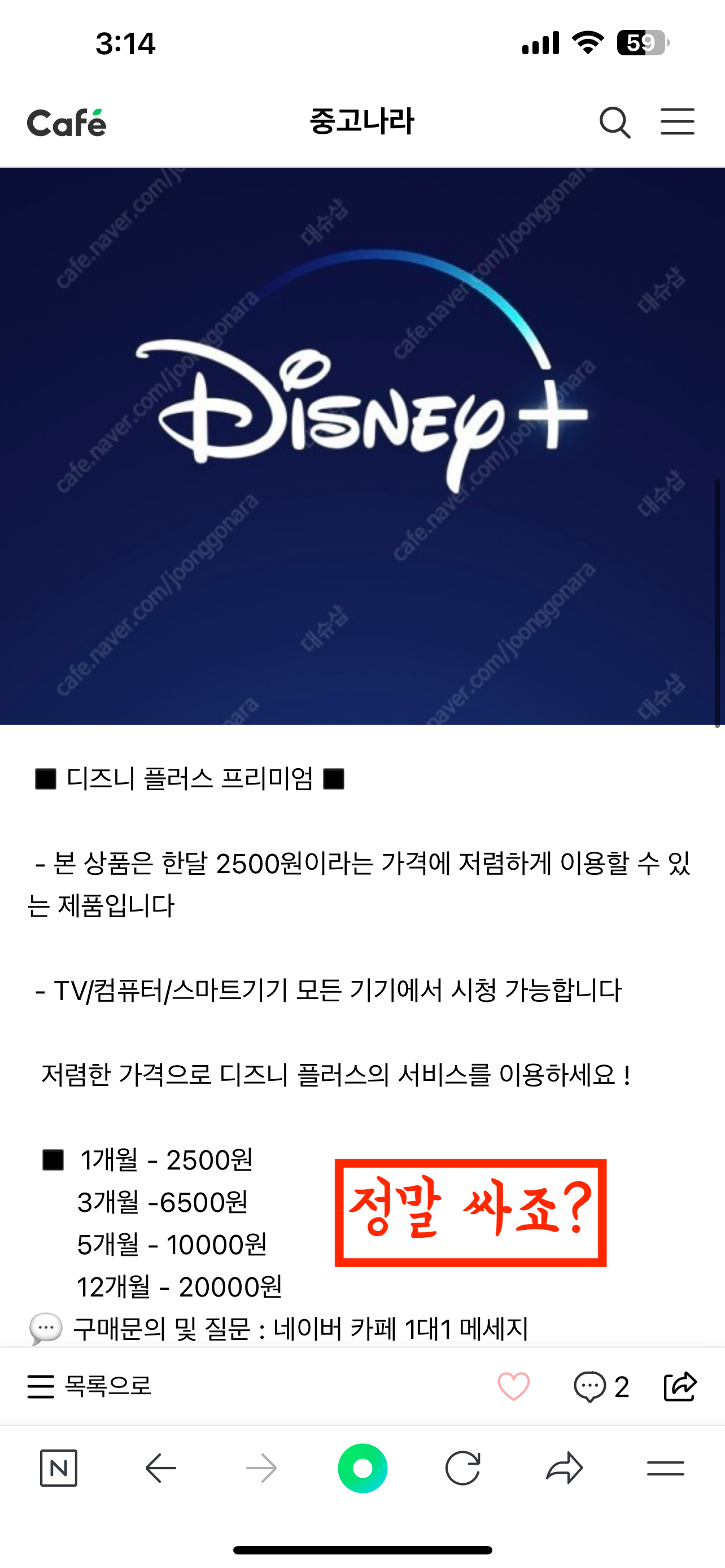 네이버 카페인 중고나라 혹은 번개장터에 디즈니 플러스를 검색해 보세요. 그러면 회원권을 가지고 있는 사람들이 셰어를 원해서 올리는 경우가 많고 회원권 쉐어링을 전문적으로 하는 업자들도 모여 있습니다.