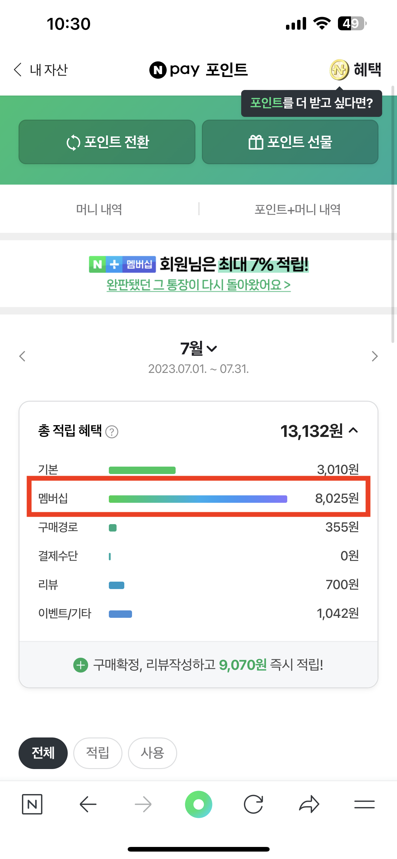 지난 세 달간 네이버 플러스 멤버십으로만 적립한 금액을 살펴보면 대략 월 8천원 정도 적립되는 것을 알 수 있는데요. 제가 한 달에 쇼핑으로 그렇게 많은 돈을 쓰지는 않지만 충분히 멤버십 가입금액보다는 많이 적립할 수 있습니다.