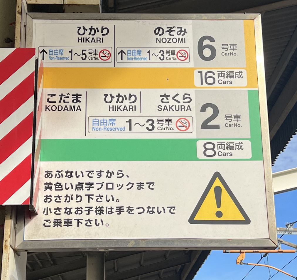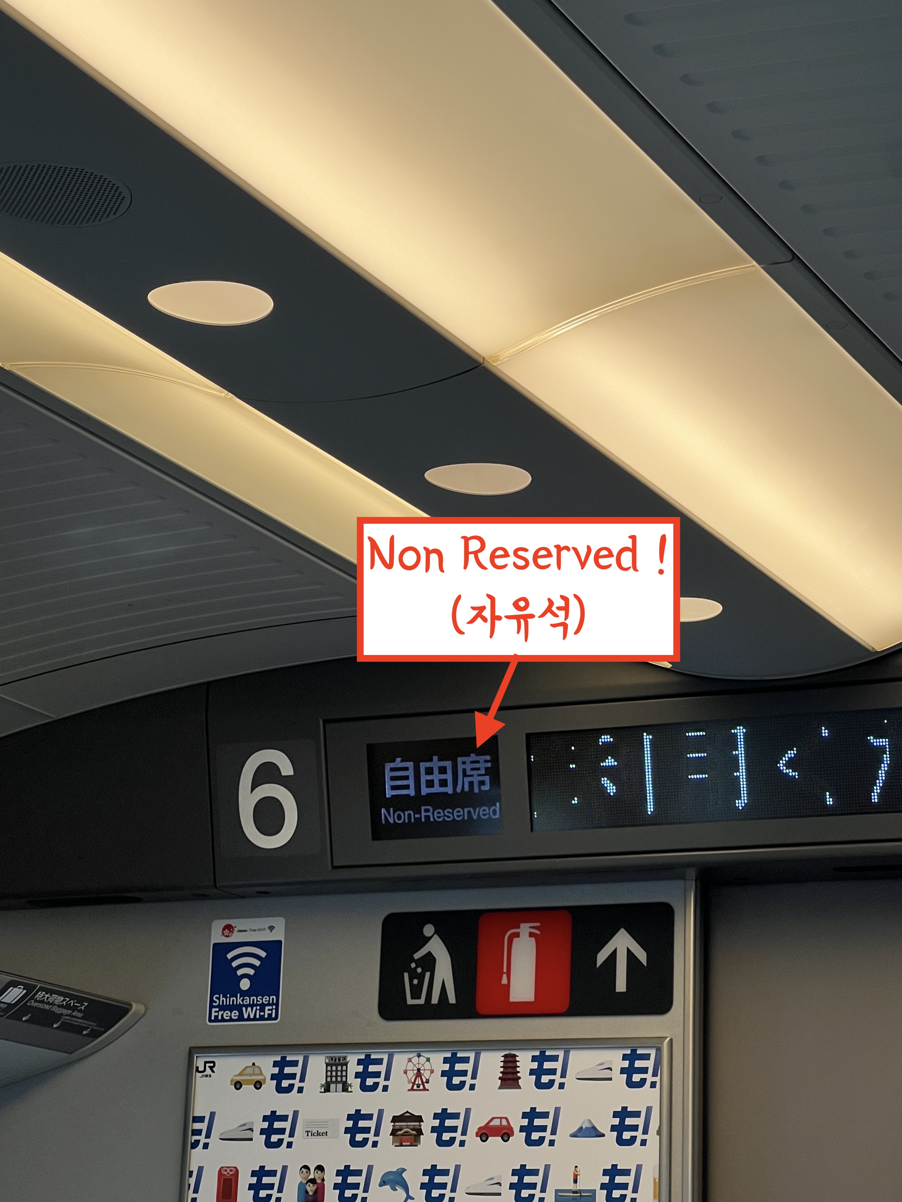 제가 일본의 모든 기차를 타본 것은 아니니 기차의 종류에 따라 자유석 지정간이 바꿀 수는 있고 본인이 예매한 기차의 종류는 전광판에 표기되니 쉽게 찾을 수 있을 거예요.