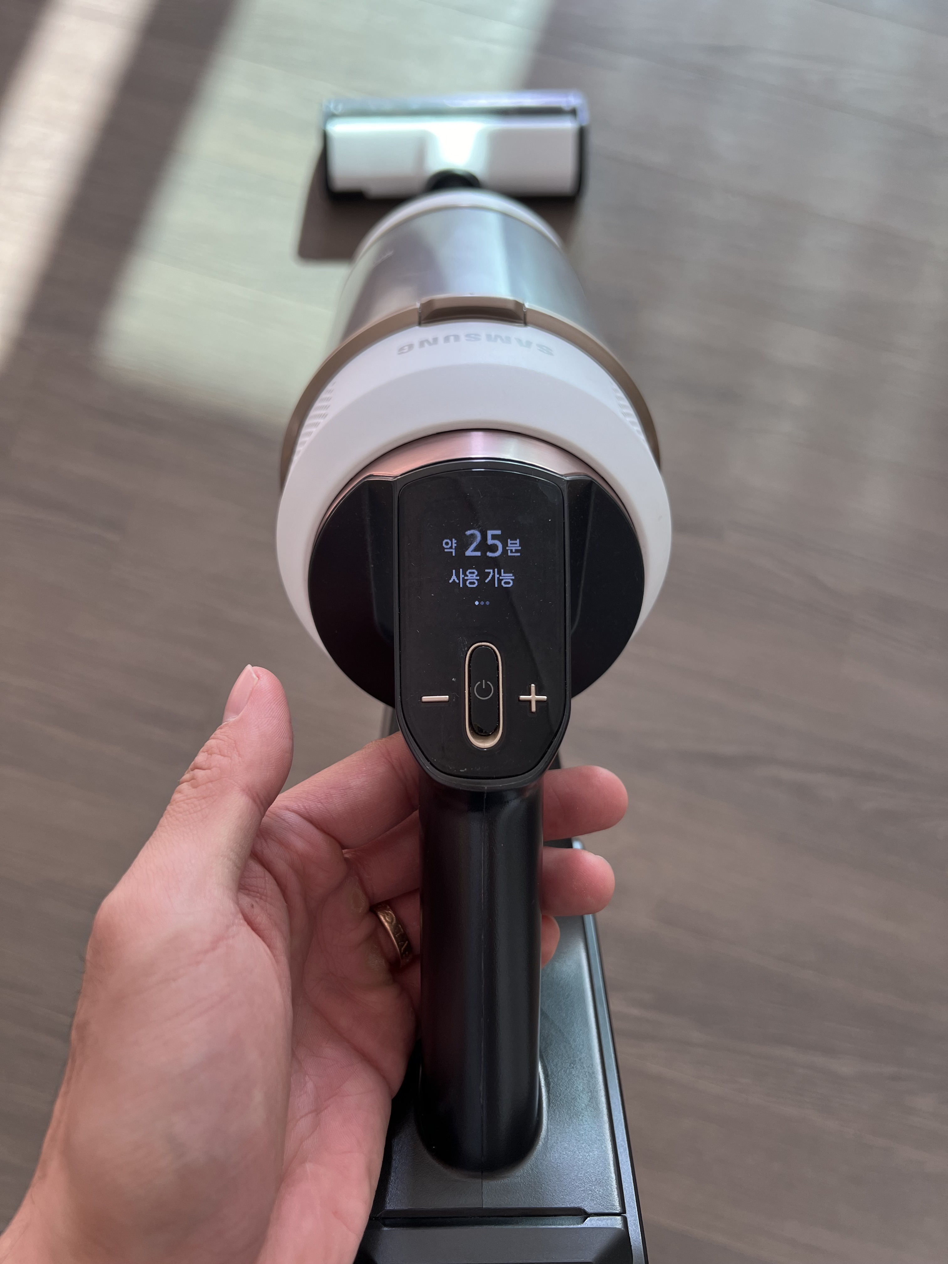 삼성 제트 청소기는 흡입력의 세기에 따라 총 세 가지 모드로 바꿀 수가 있는데요. 1년을 사용한 결과 각 모드를 활성화했을 때 사용 가능한 시간은 25분 , 15분, 9분입니다. 저희 집이 34평 국평으로 넓지도 좁지도 않은 일반적인 아파트인데 일반 모드로 사용했을 때 충분히 청소를 하고도 배터리는 남아 있습니다.