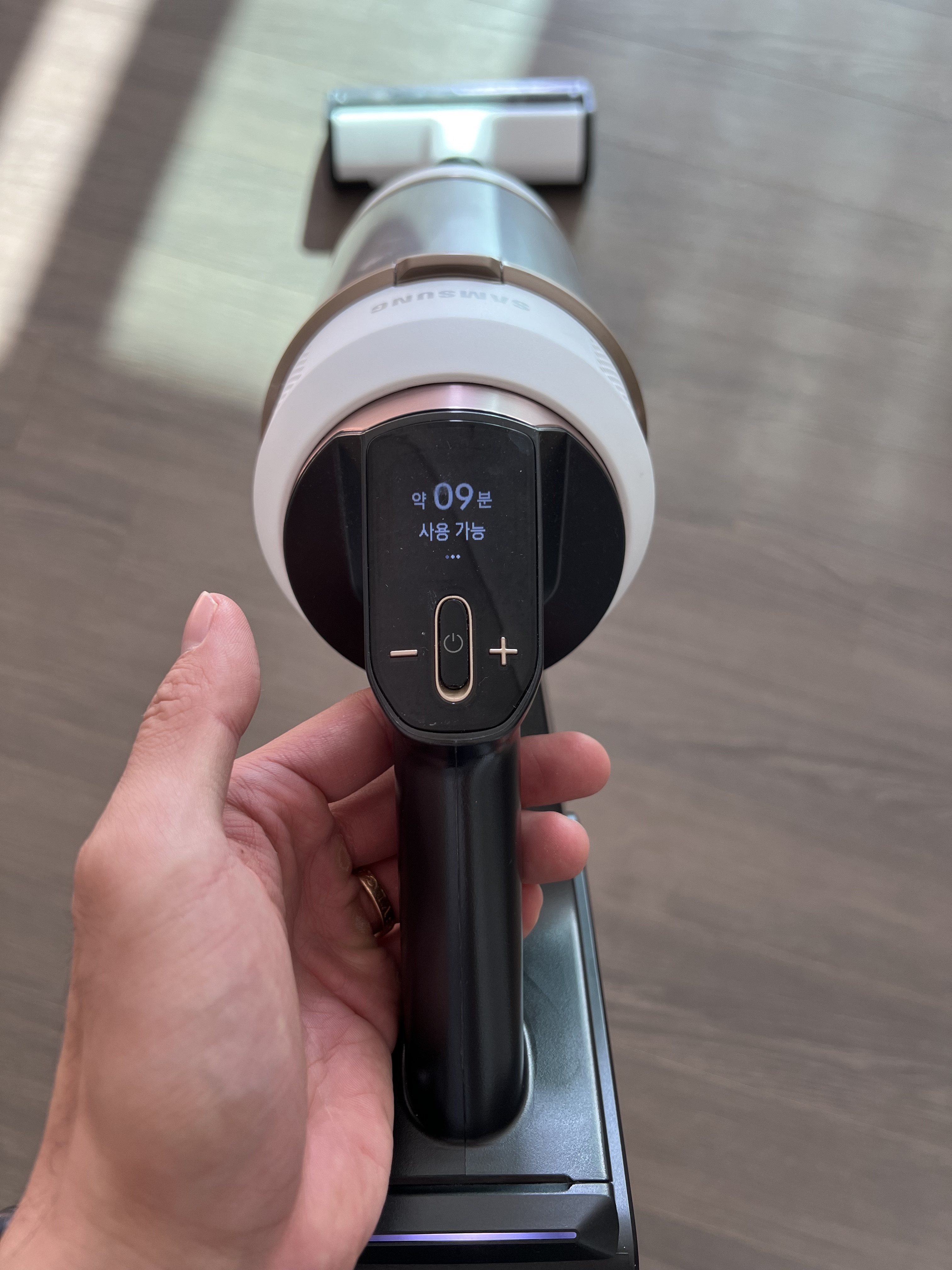 삼성 제트 청소기는 흡입력의 세기에 따라 총 세 가지 모드로 바꿀 수가 있는데요. 1년을 사용한 결과 각 모드를 활성화했을 때 사용 가능한 시간은 25분 , 15분, 9분입니다. 저희 집이 34평 국평으로 넓지도 좁지도 않은 일반적인 아파트인데 일반 모드로 사용했을 때 충분히 청소를 하고도 배터리는 남아 있습니다.