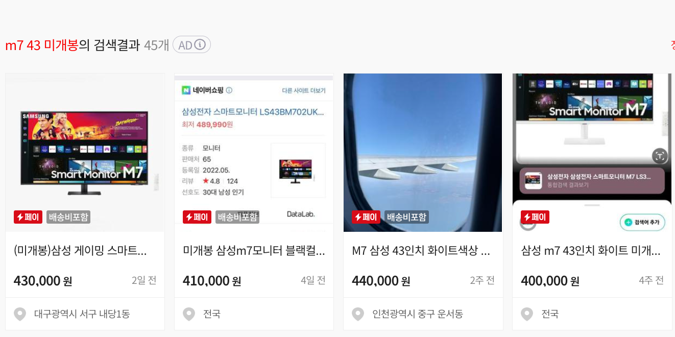삼성전자는 혼수가전이나 입주가전을 마련할 때 사은품으로 추가 가전제품을 제공하기도 하는데, M7 43인치가 사은품으로 꽤나 풀렸습니다. 그래서 당근마켓이나 번개장터에 미개봉 상품을 쉽게 찾을 수 있고 구매하기 전에 중고마켓을 한 번 찾아보는 것도 좋은 방법입니다.