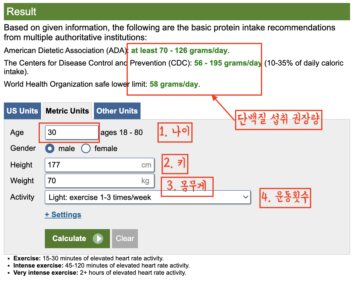 아래 사이트에 접속하여 나이, 몸무게, 키를 입력하면 단백질 섭취 권장량을 보여주는데 각 기관별로 다르니 재미로 보시면 될 것 같아요. 별도의 회원가입 필요 없이 바로 검색할 수 있으니 아래 링크로 들어가 보세요.