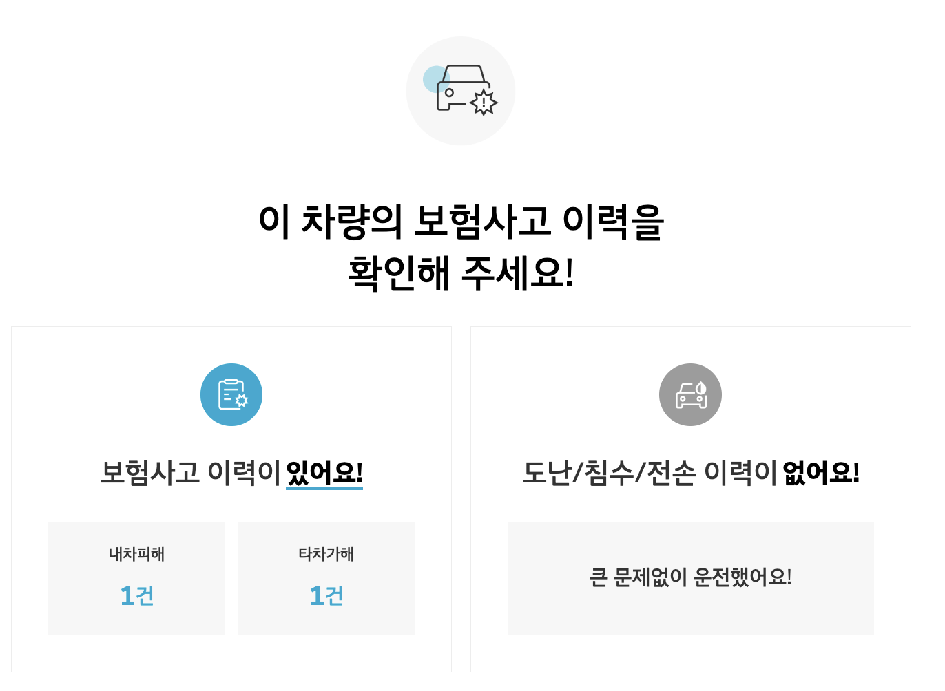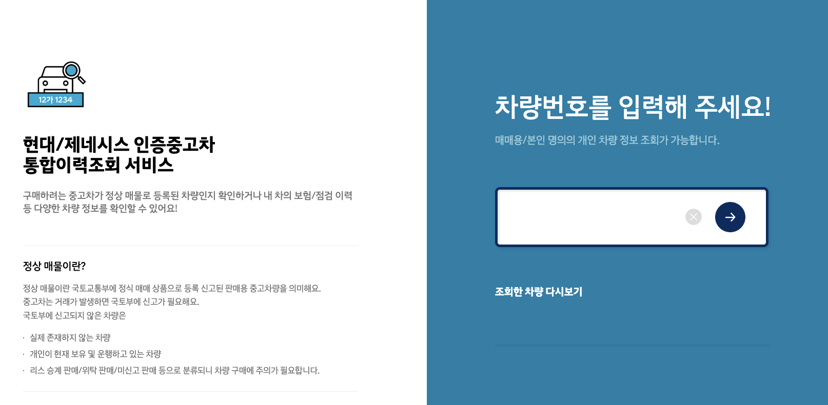 현대 인증 중고차에서는 헤이딜러나 다른 중고차 플랫폼과 비슷하게 중고차의 통합 이력을 검색해 볼 수 있습니다. 보이는 정보는 다른 사이트와 큰 차이는 없지만 UI가 깔끔해서 직관적이고 다른 광고 없이 필요한 정보만 볼 수 있다는 것은 큰 장점입니다.
