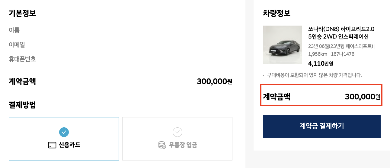 원하는 차량을 확인하고 구매하기 버튼을 누르면 마지막으로 차량의 하자를 보여주는 화면이 나오는데 계약금은 단돈 30만 원이에요. 차량을 전달받고 7일간 시승 이후 차량이 마음에 들지 않는다면 잔여 금액 결제가 필요 없이 전액 환불이 됩니다.