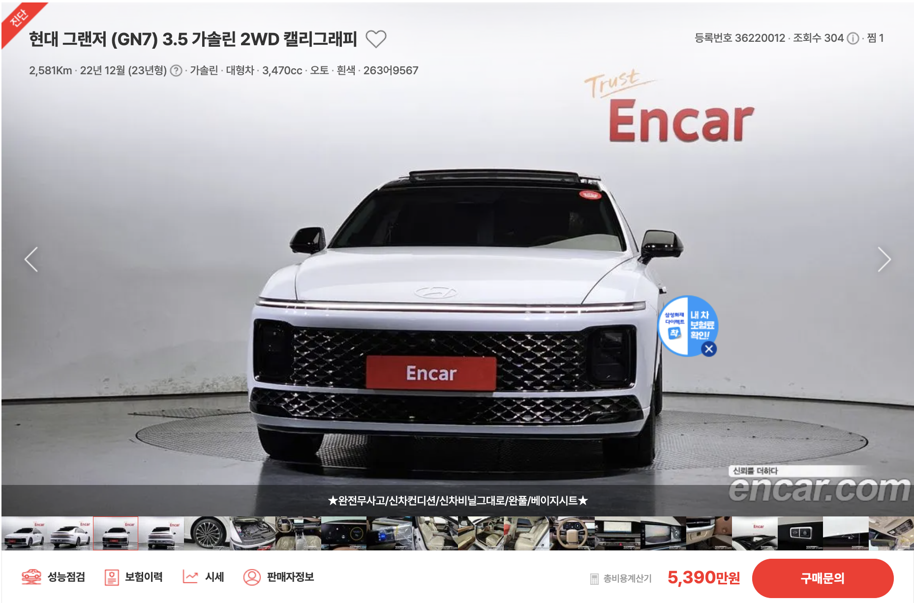 그렇다면 중고차 거래로 가장 많이 사용하고 있는 엔카에 등록된 차량과 비교해 보겠습니다. 동일한 차량은 없고 가장 유사한 모델로 살펴보겠습니다.