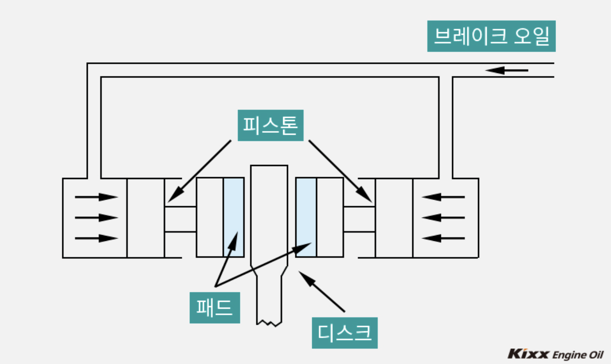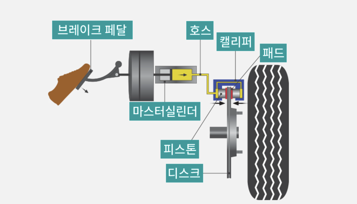 우리가 운전 중에 브레이크 페달을 밟으면 브레이크 오일(브레이크 액)이 바퀴 안쪽에 있는 캘리퍼에 주입이 되고 피스톤이 밀려나는데 피스톤이 밀어낸 거리만큼 브레이크 패드와 디스크가 마찰이 발생하여 바퀴의 제동이 발생하고 그 결과 속도가 줄어들고 차량이 멈추게 됩니다.