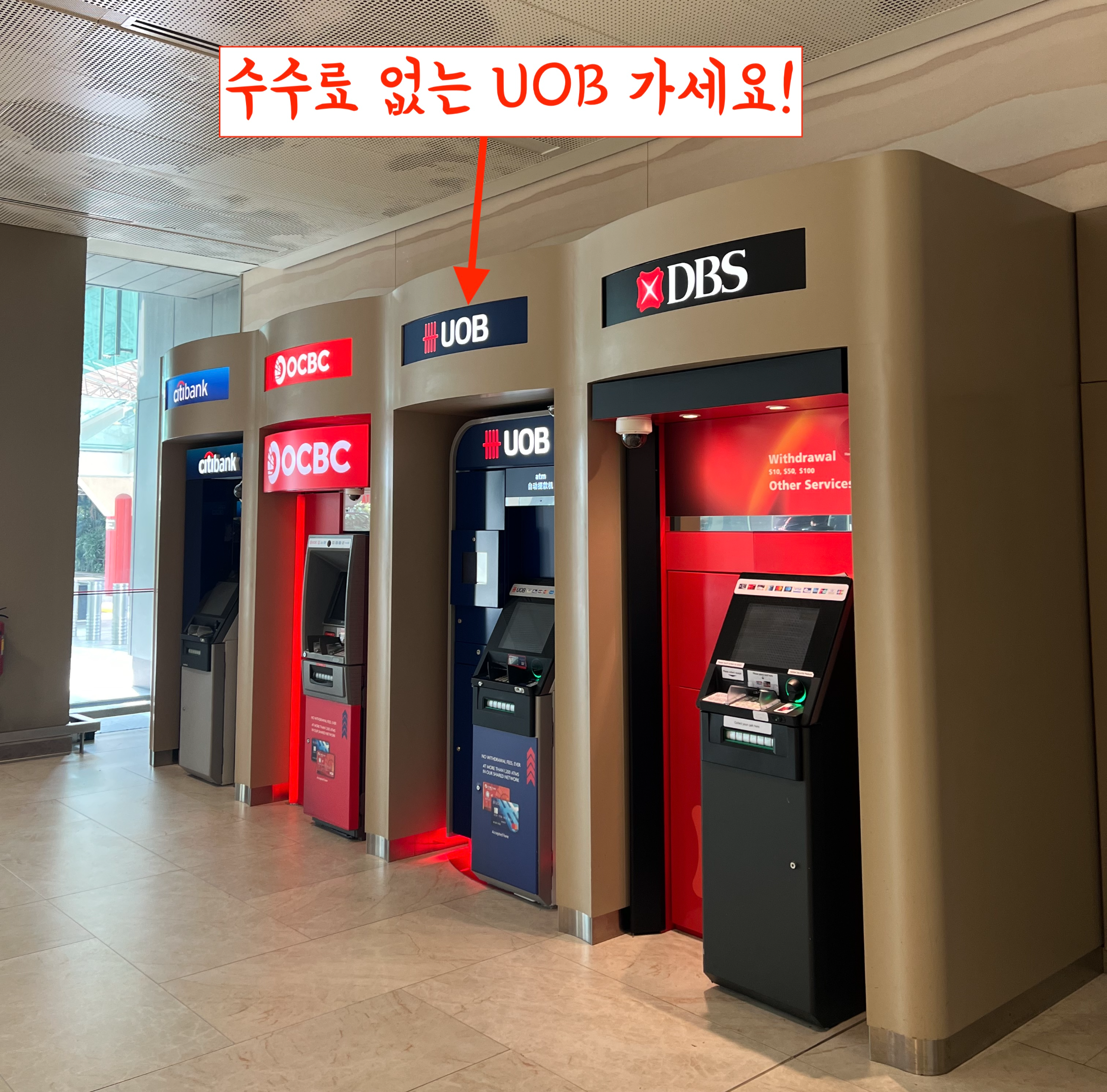 다른 거 생각하지 마시고 수속을 마치고 나온 뒤 창이공항의 맥도널드를 찾아가세요! 창이공항 맥도널드 앞에는 ATM 기기 4대가 사이좋게 놓여 있습니다. 4대의 기기가 모두 회사인데 UOB에서 꼭 현금을 찾으세요. 수수료가 발생하지 않습니다.