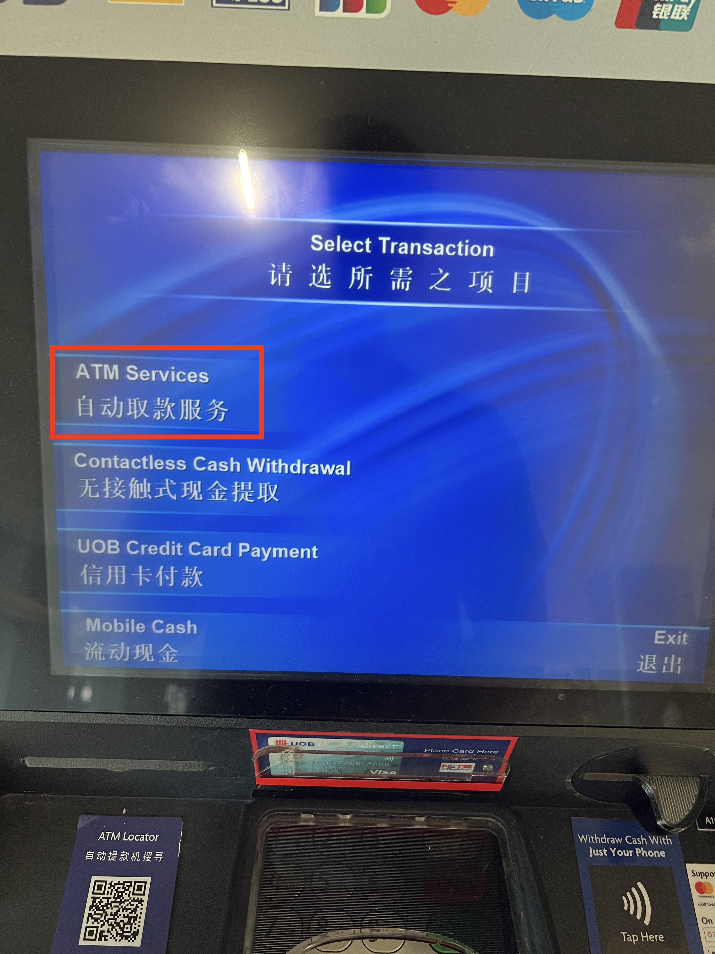 UOB ATM 기기를 찾았다면 이제는 현금을 인출해 볼까요? 영어가 익숙한 분들이야 쉽게 찾아서 할 수 있겠지만 그렇지 않은 분들은 헤멜 수도 있을 것 같아요.
