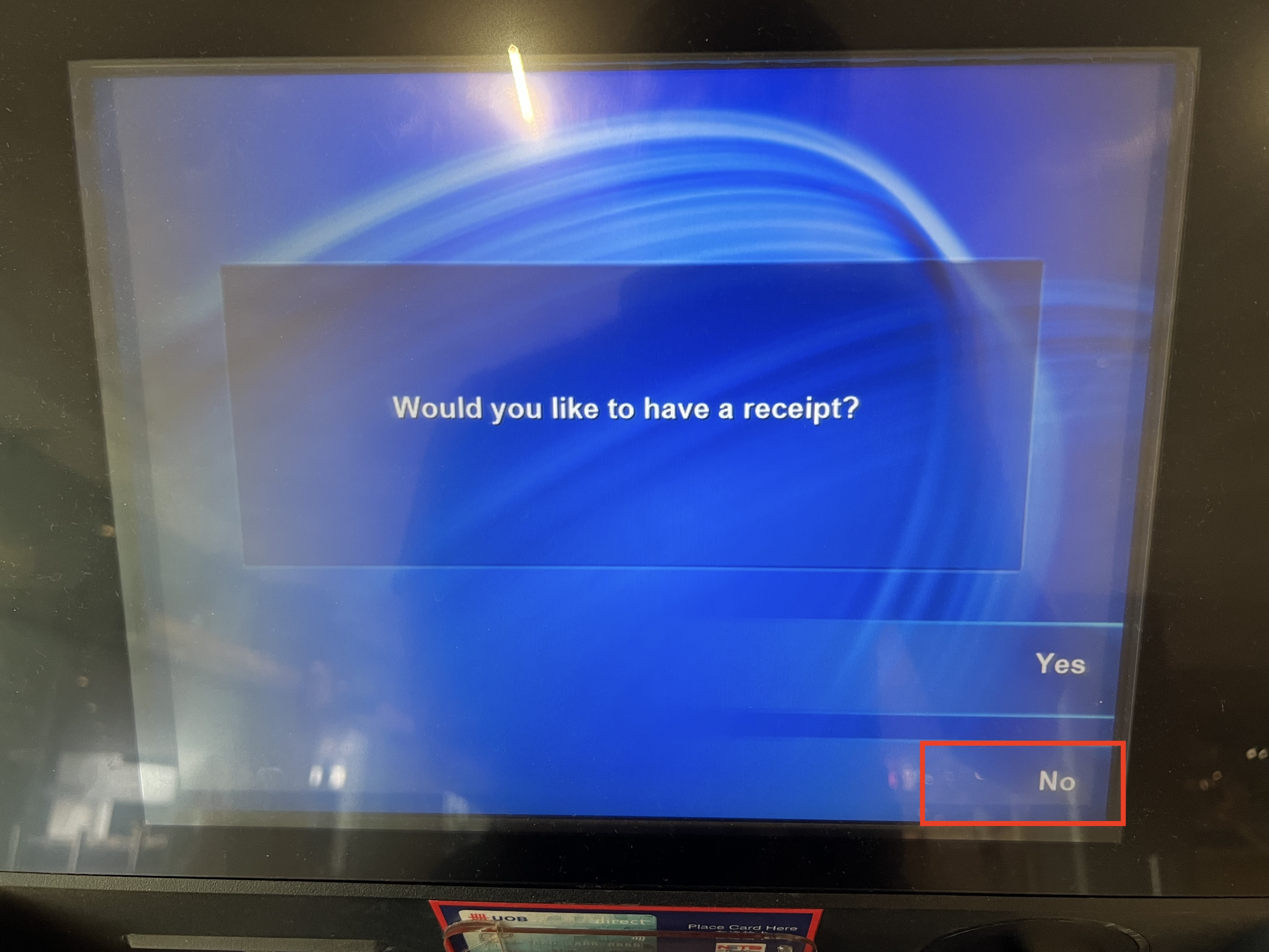 - Would you like to have a receipt? (영수증 출력 하시겠어요?) 화면에서 No 선택