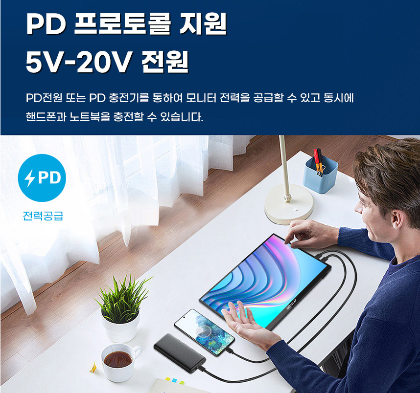 두 번째로 주목해야 되는 스펙은 PD 충전입니다. 한 때는 정말 고사양 노트북에만 들어가던 사양으로 PD 충전을 이용한다면 모니터 전력을 공급할 수 있고 핸드폰과 노트북을 충전할 수도 있습니다. 가장 편리한 점은 충전기가 없는 상황에서도 노트북이나 스마트폰 같이 배터리가 있는 제품이라면 화면출력이 가능한 것입니다.