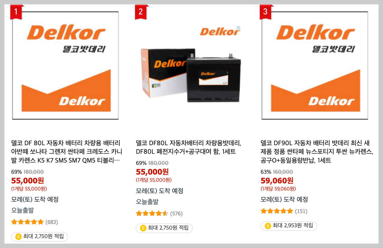 배터리 가격은 쿠팡 판매 1위 제품은 델코 DF 80을 참고했어요. 차량에 따라 적용되는 배터리 종류가 다르기 때문에 반드시 제품 상세페이지의 차량제원표를 확인해 보는 것을 추천드립니다.