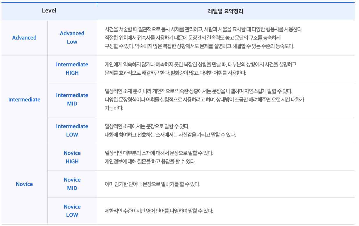 오픽 등급은 총 7개로 나뉘어 있습니다. 보통 어느 정도 준비를 하게 되면 Intermediate Low, Mid, High 등급을 많이 받는 것 같고 조금 더 숙달이 되더라도 Intermidated High에서 꽤 오랫동안 머무는 것 같아요.