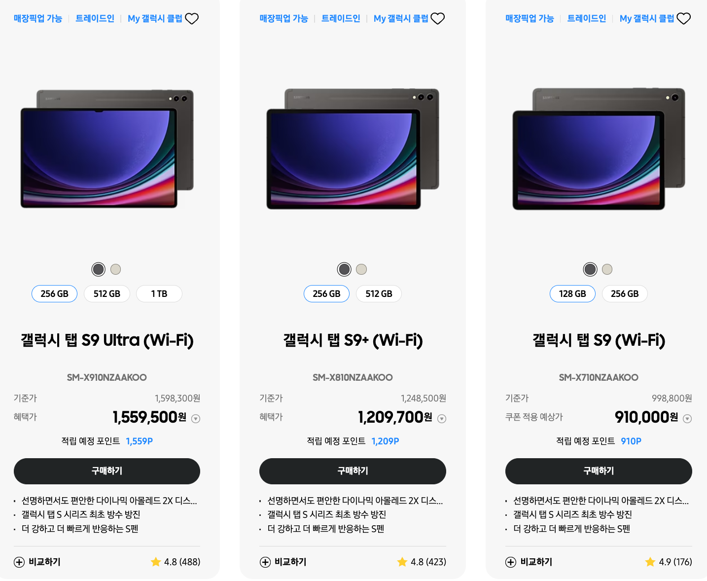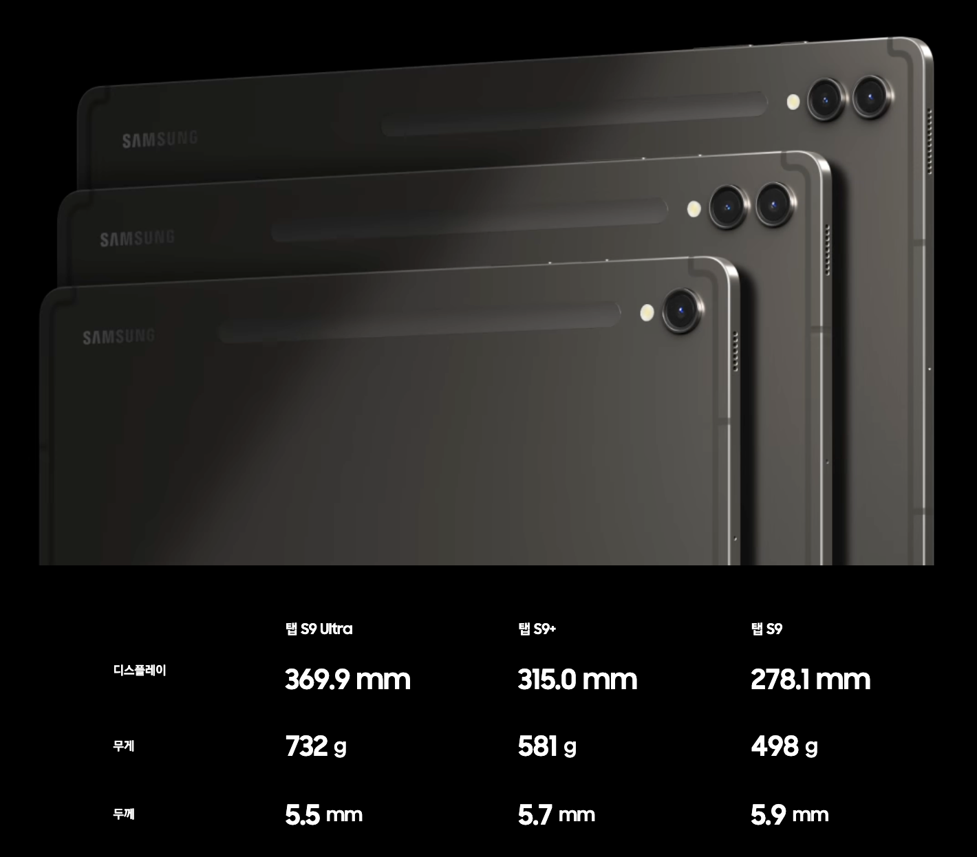 | 갤럭시탭 S9 Ultra | 갤럭시탭 S9+ | 갤럭시탭 S9 | |
