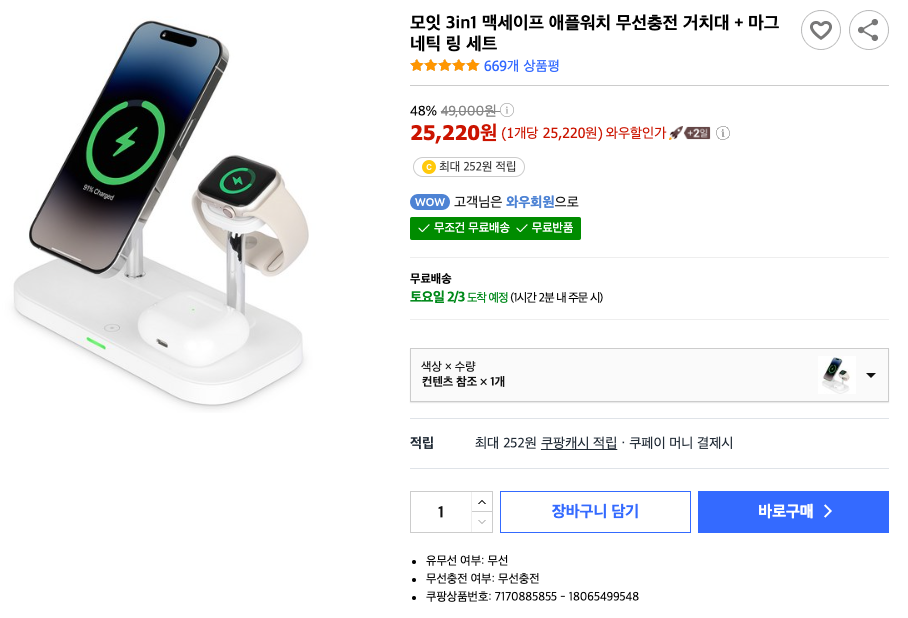 깔끔한 책상 정리를 위해 3 in 1 충전기를 알아보고 있었는데 정말 너무 종류가 많아서 어떤 제품을 사야 할지 모르겠더라고요. 쿠팡, 네이버, 알리 익스프레스까지 충전기를 찾아보니 결정장애가 올 것만 같아서 쿠팡에서 판매 수가 가장 많았던 모잇 3 in 1 무선충전기를 사기로 했습니다.
