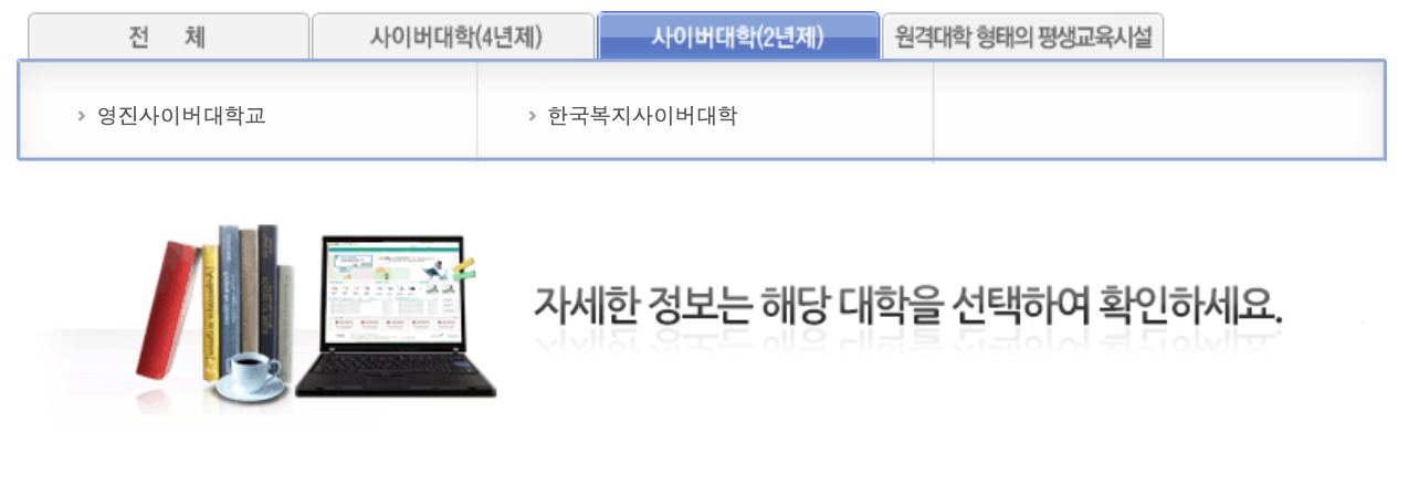 - 2년제 사이버대학 : 영진사이버대학교, 한국복지사이버대학