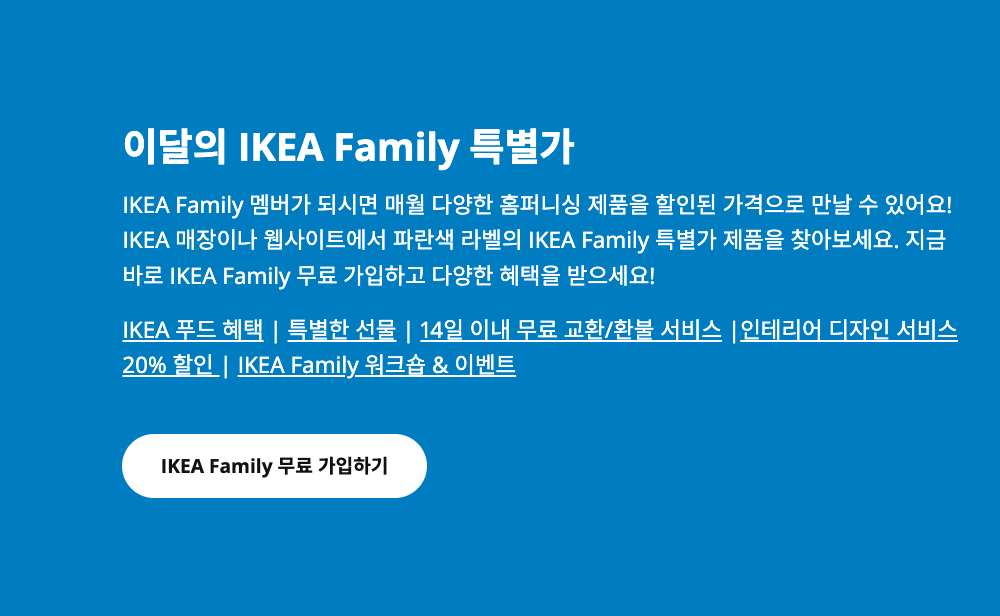 이런 이케아에서 2월 14일까지 최대 15% 할인받을 수 있는 행사를 하고 있는데, IKEA Family 멤버에 가입하면 할인된 특별가로 가구를 구매할 수 있습니다.