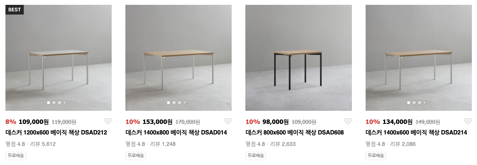 데스커는 최근 가장 인기 있는 가구 브랜드 중 하나입니다. 가장 기본이 되는 책상이 10만원 극초반대로 합리적인 가격과 깔끔한 디자인이 특징인 브랜드입니다.
