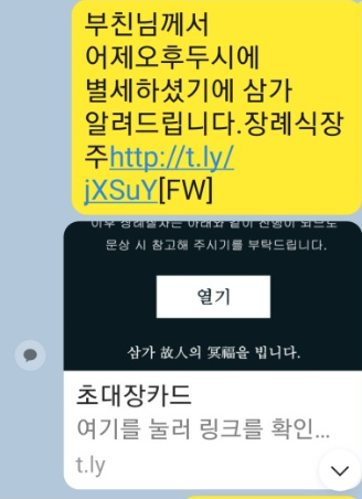 찝찝한 마음에 직접 전화해서 물어보니 그런 문자를 보낸 적이 없다는 거예요. 정말 놀라운 것은 제 동생과 어머니도 똑같은 부고 문자를 받았고 링크를 클릭했는데 알고 보니 모바일 스미싱 수법 중에 하나였어요. 악성코드 감염이니 통장에 있는 돈을 빼갈 수 있다는 이야기까지도 있어 저도 식겁하고 이래저래 조치를 취했네요.