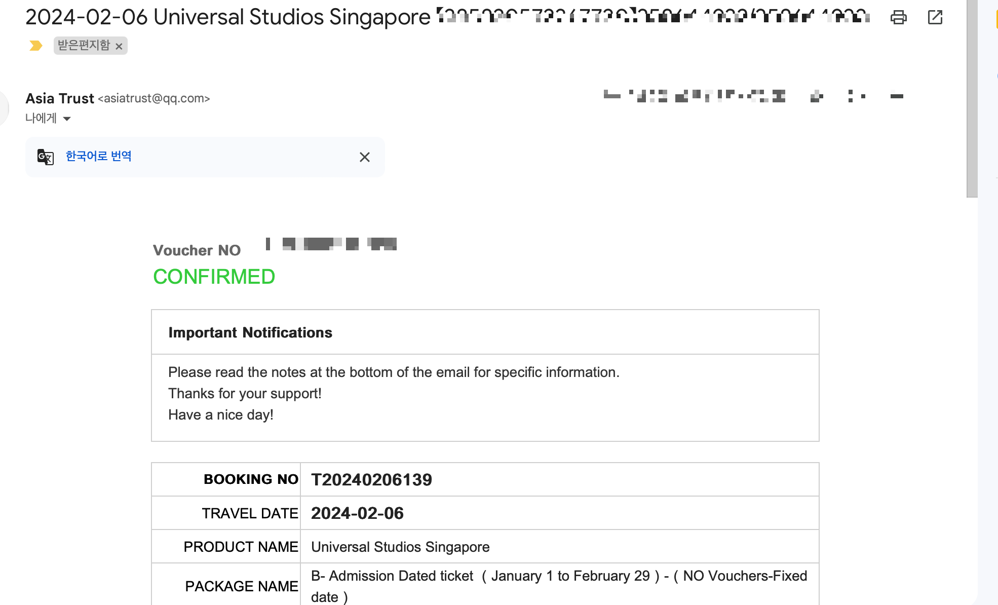 티몬에 들어가서 구매를 하게 되면 Asia Trust라는 곳에서 메일을 받는데요. 예약 확정(Booking Confirmation)을 받게 되고 첨부 파일에 티켓을 확인할 수 있어요.