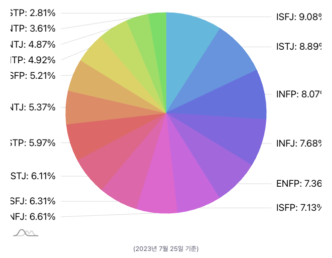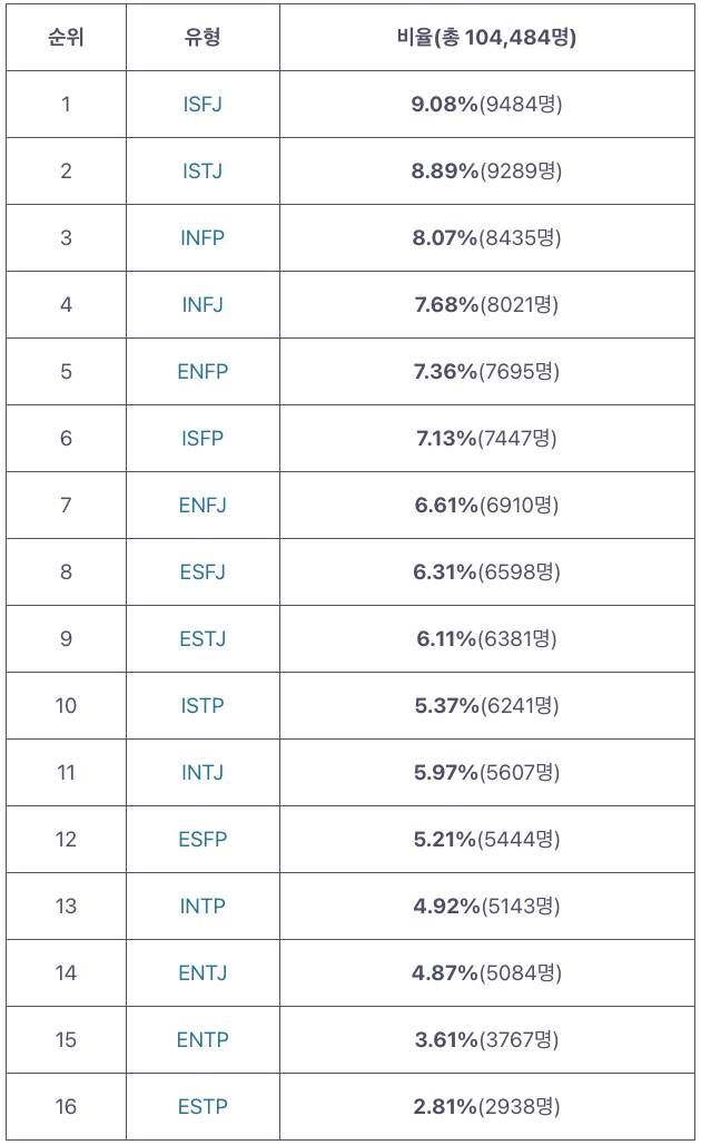 한국 사람들의 MBTI 순위는 어떤지 궁금하지 않으세요? 저는 아주 뚜렷한 잇티제(ISTJ)로써 ISTJ의 비율이 가장 높은 줄 알았는데 공식 집계 결과를 보니 의외로 ISFJ가 가장 많은 9.08%를 기록했습니다. 반대로 비중이 가장 낮은 MBTI는 ESTP로 2.81%를 보여주고 있습니다.