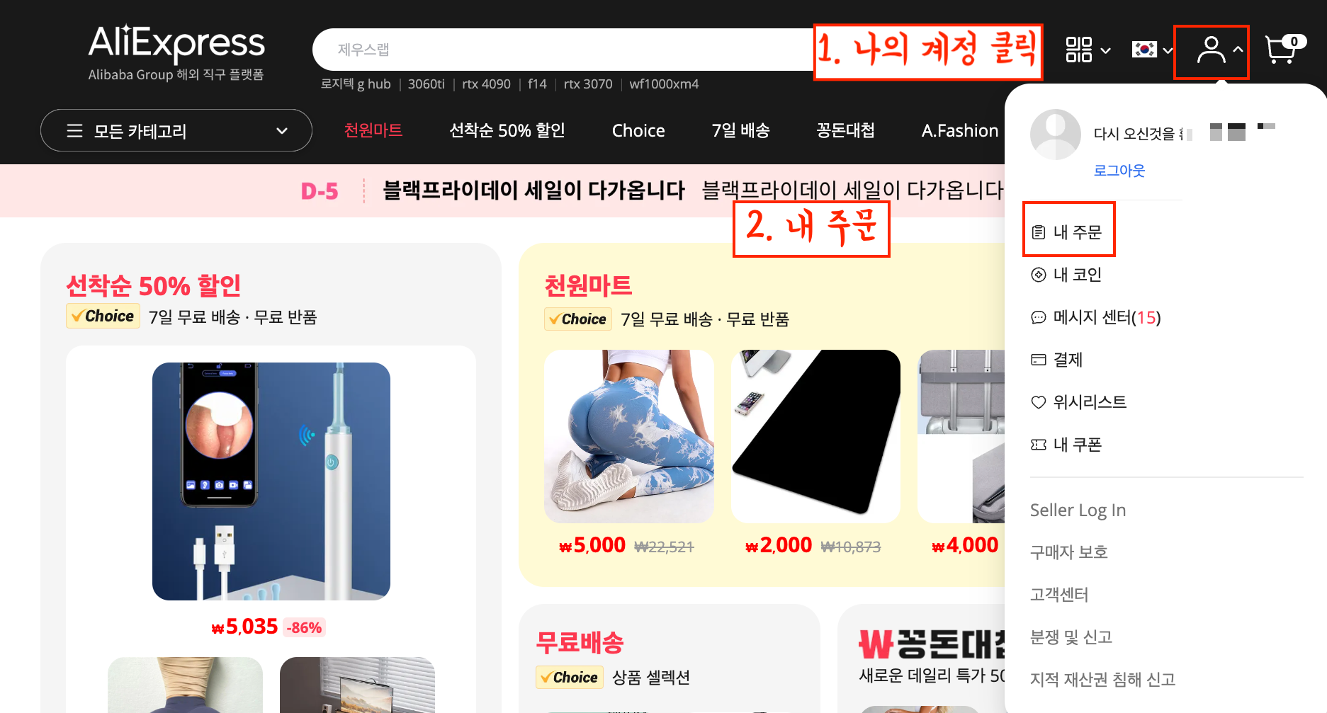 배송 조회하는 화면은 일반 인터넷 쇼핑몰과 비슷합니다. 알리 익스프레스에 접속 후 로그인을 하고 내가 주문한 상품 페이지에 들어가면 직관적으로 배송현황을 볼 수 있습니다.